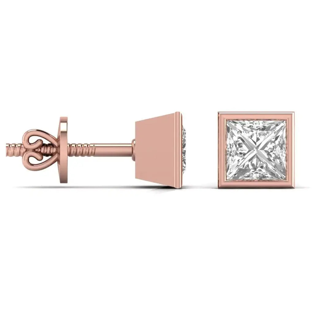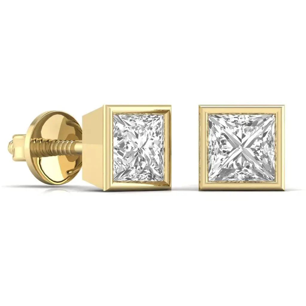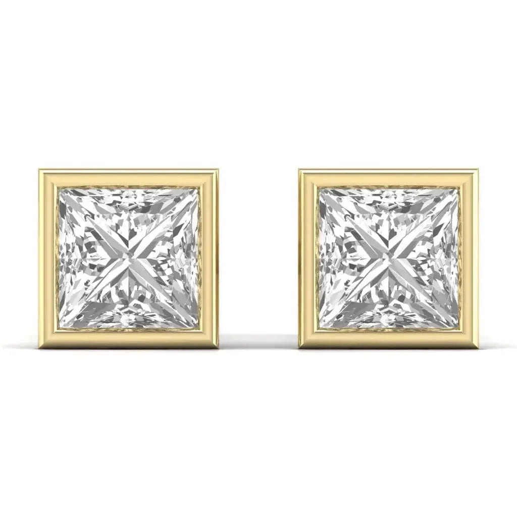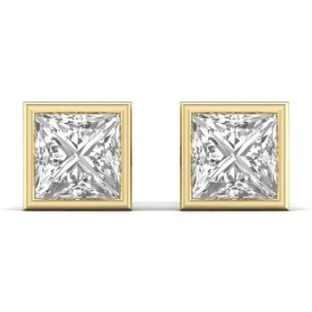 These 1.5 carat each princess-shaped lab grown diamond bezel stud earrings offer a refined blend of modern design and ethical luxury. The secure bezel setting highlights the diamonds' brilliance while providing durability, making them an elegant choice for daily wear or special occasions. Experience timeless sophistication with a responsible sparkle.