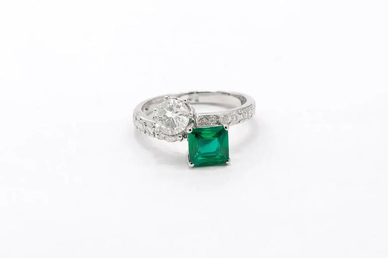 2.46 Carat Round Cut Diamond & Emerald Cut Green Stone Gold Ring