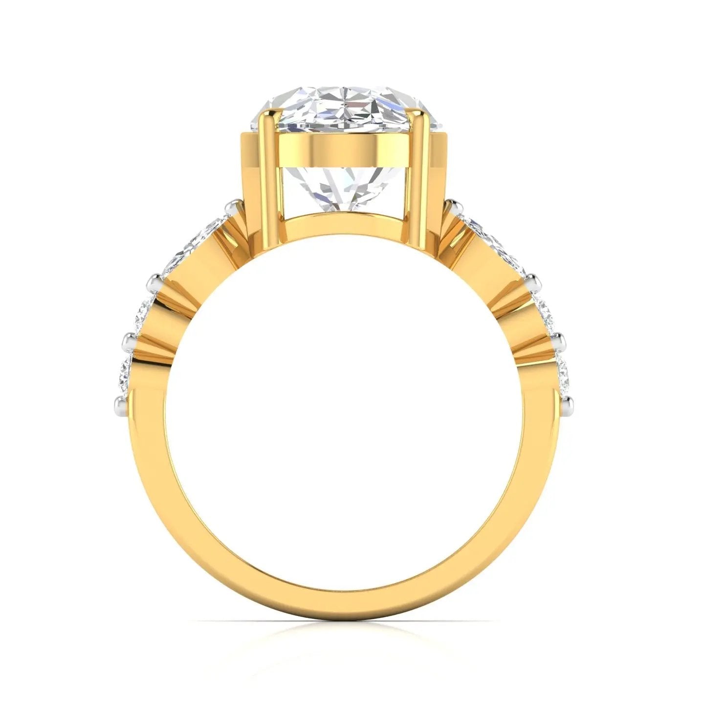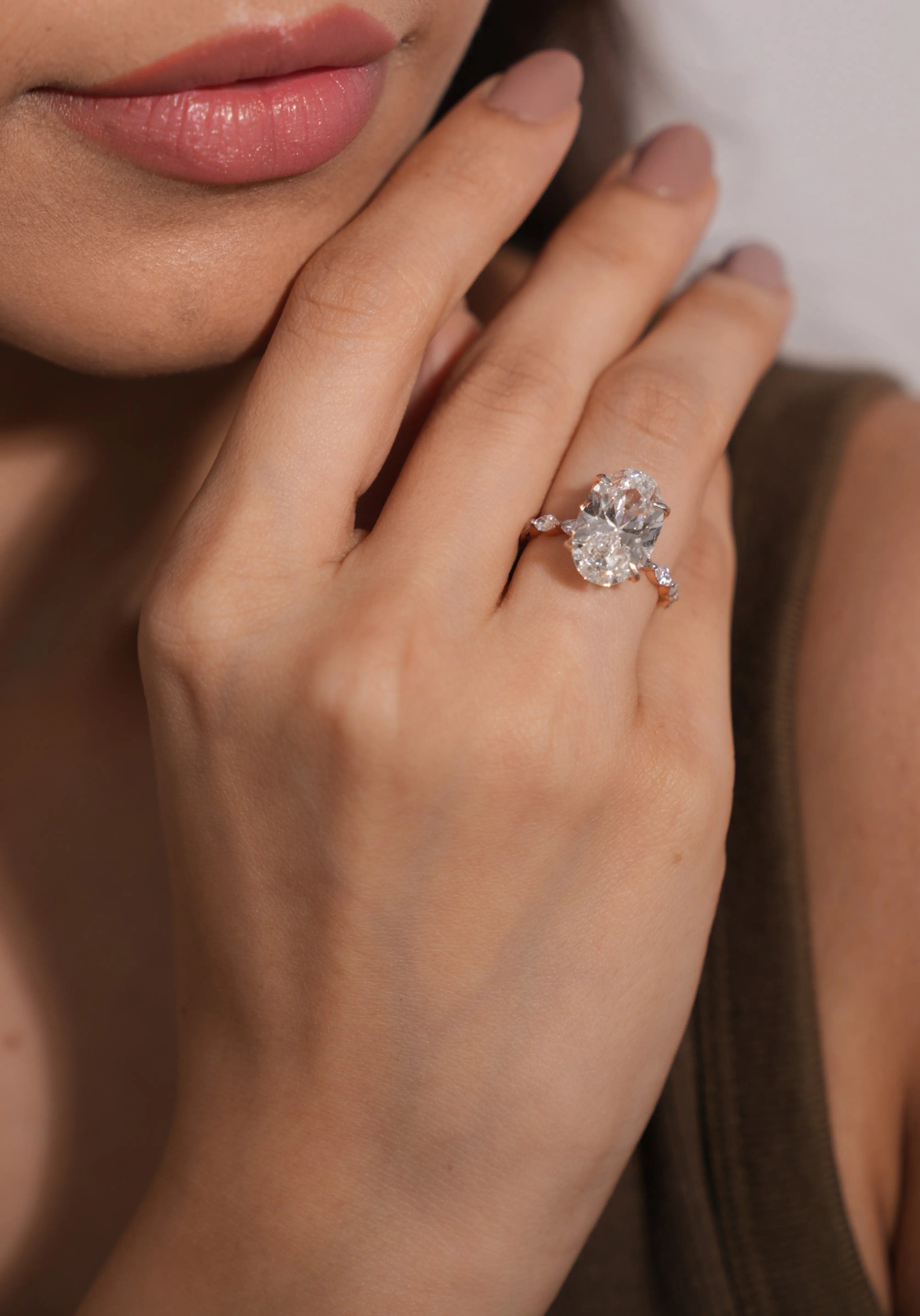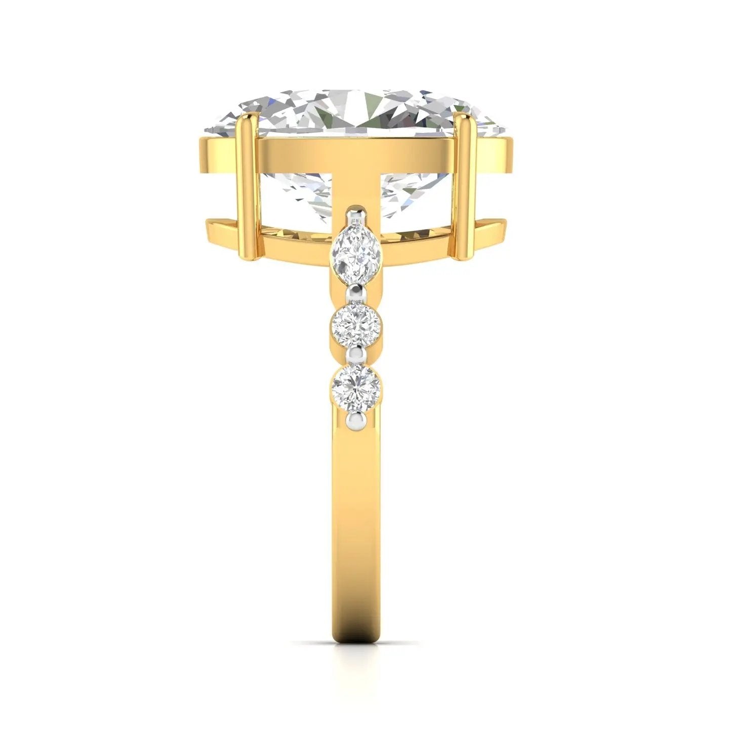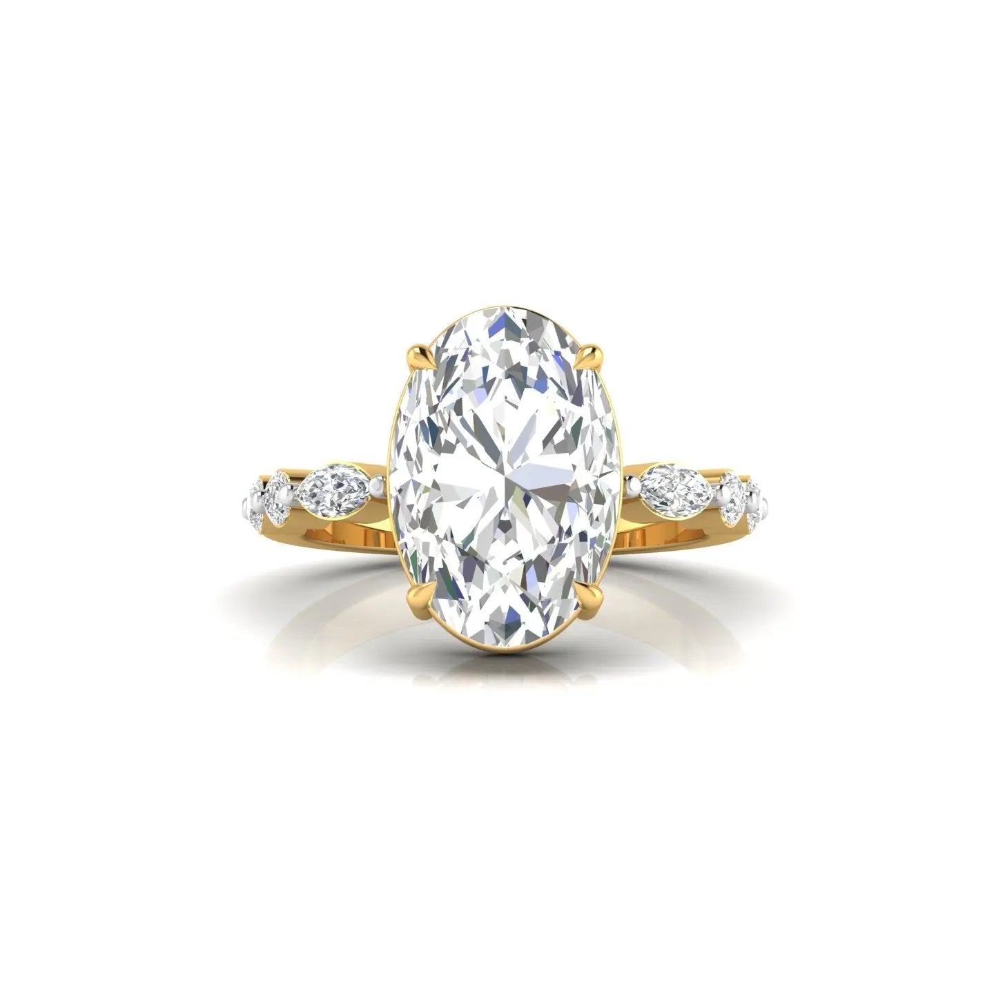 3.8 Carat Oval Diamond Engagement Ring exemplifies expert craftsmanship with its lab-grown oval cut diamond set in a classic gold solitaire band. Featuring marquise accent stones and a precise prong setting, the design maximizes brilliance and elegance. Perfect for discerning buyers seeking luxury, this ring blends timeless style with ethical sophistication, ideal for engagements and weddings.