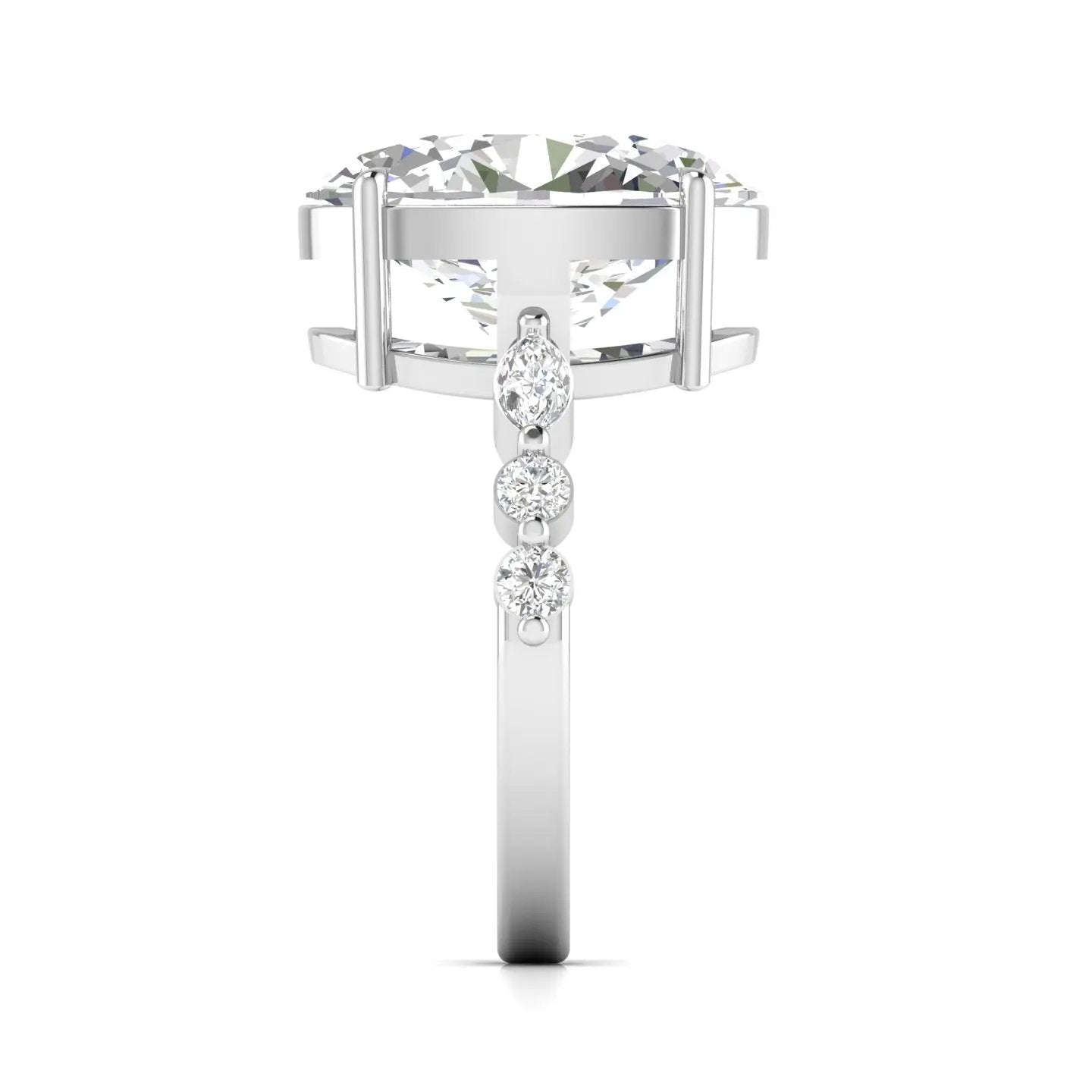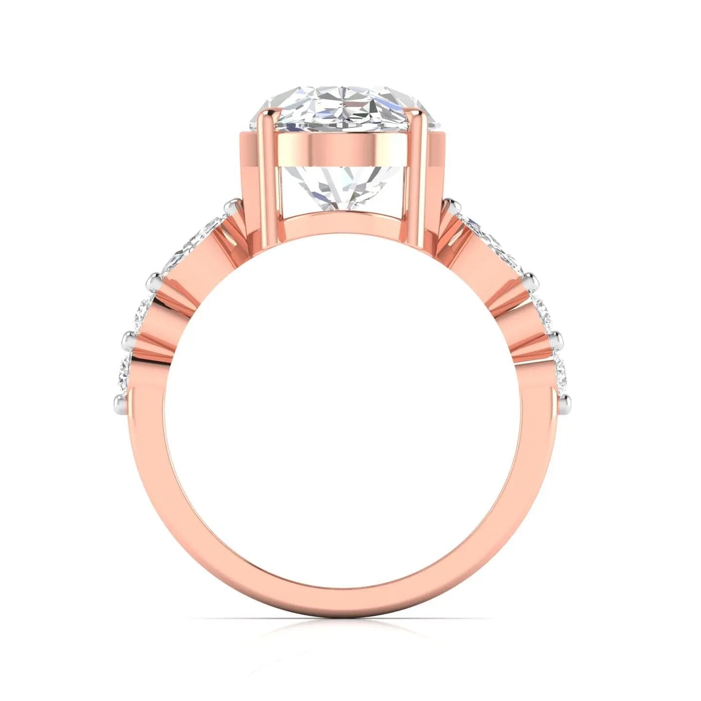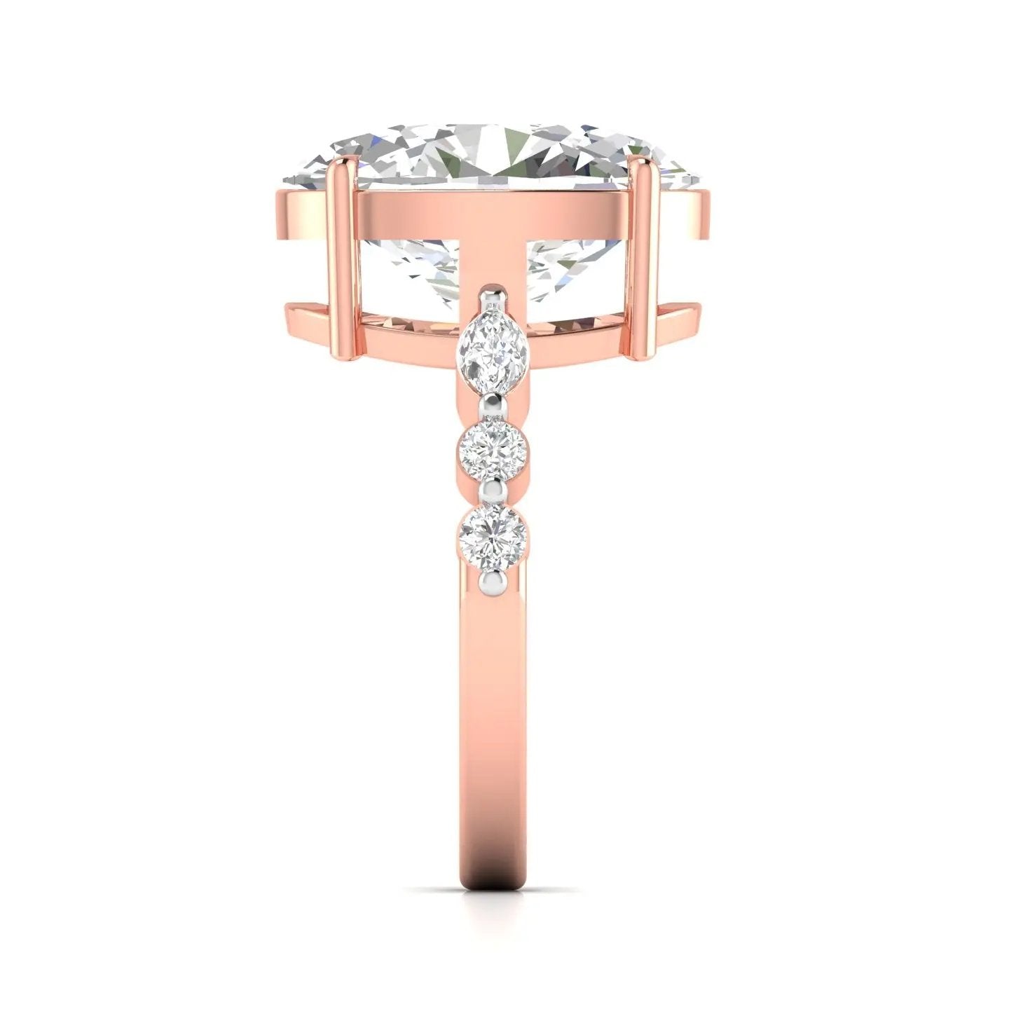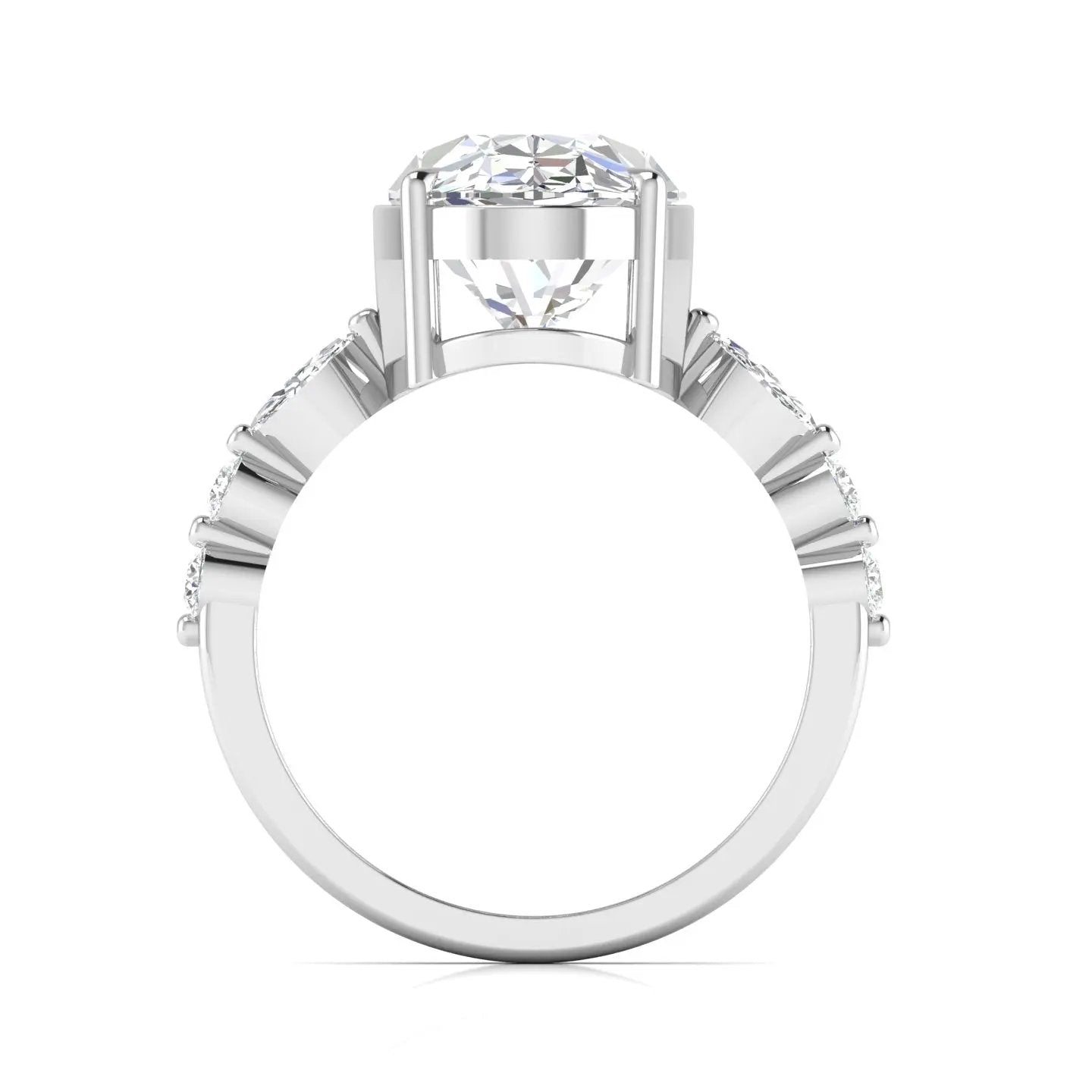 3.8 Carat Oval Diamond Engagement Ring exemplifies expert craftsmanship with its lab-grown oval cut diamond set in a classic gold solitaire band. Featuring marquise accent stones and a precise prong setting, the design maximizes brilliance and elegance. Perfect for discerning buyers seeking luxury, this ring blends timeless style with ethical sophistication, ideal for engagements and weddings.
