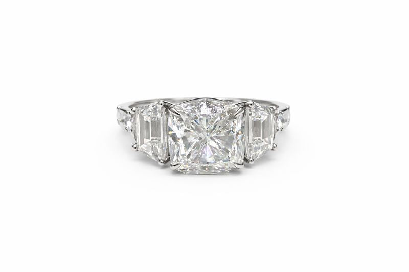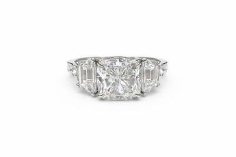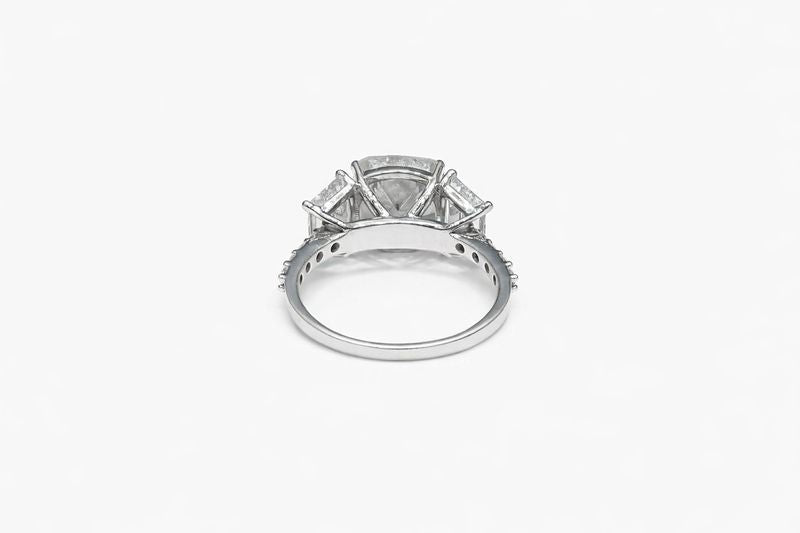 5.560 Carat Cushion Cut Diamond Engagement Ring with Emerald Side Stones