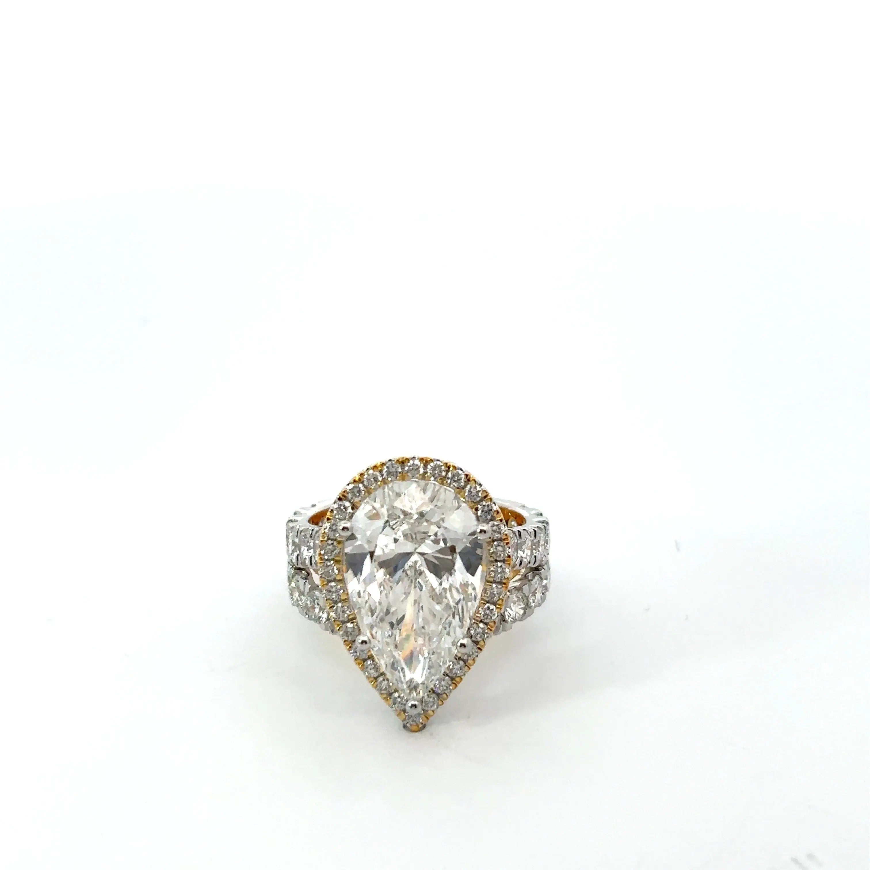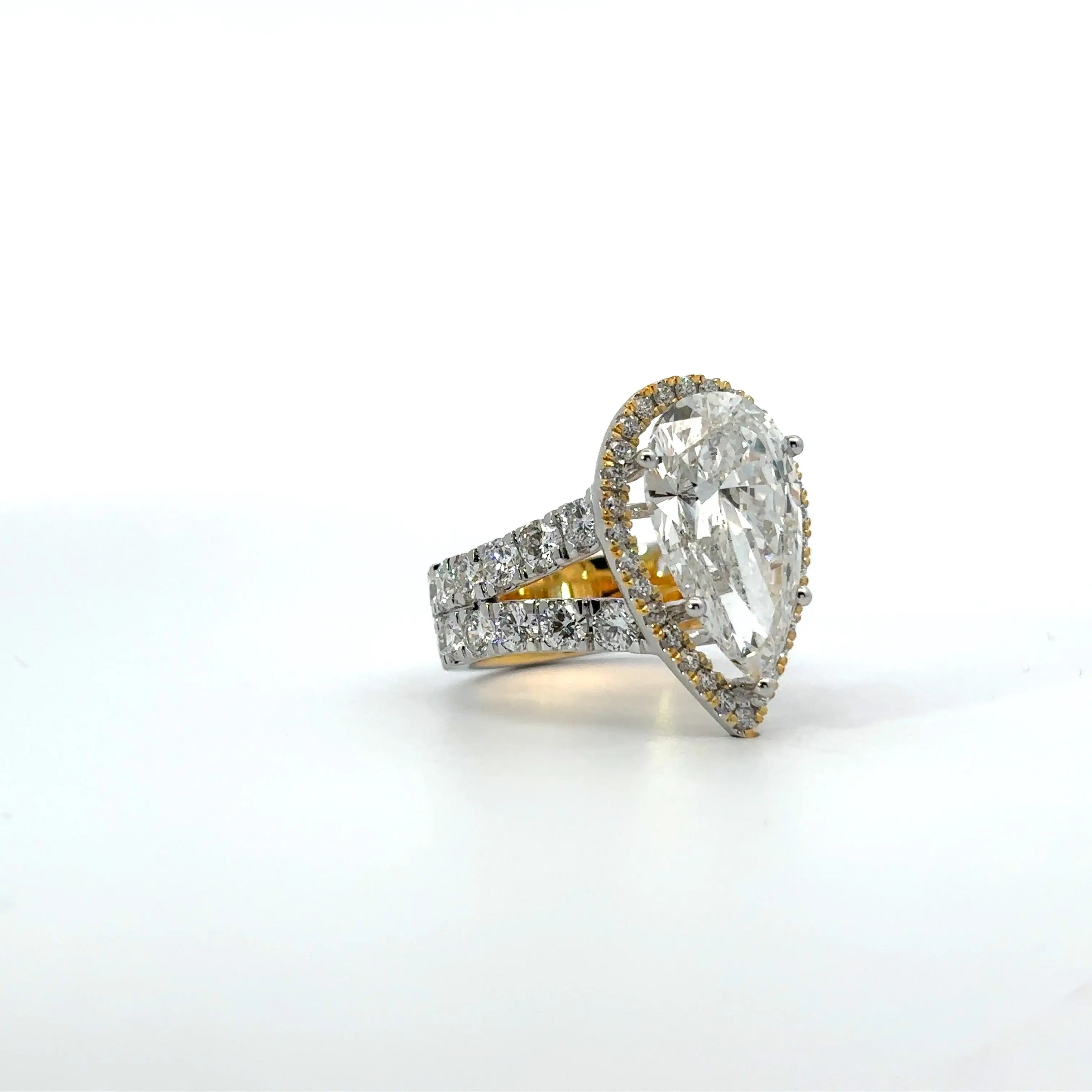 This 5 Carat Pear Solitaire Diamond Ring with a halo design showcases a brilliant lab grown diamond, combining ethical craftsmanship with exquisite elegance. Its timeless silhouette and sparkling halo accentuate the diamond’s clarity and fire, making it a sophisticated choice for those who value both beauty and sustainability.