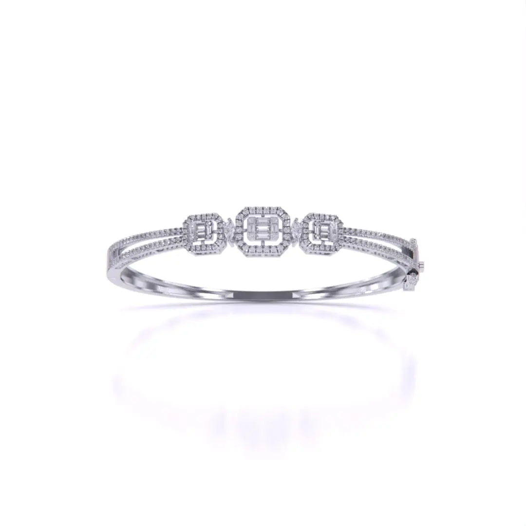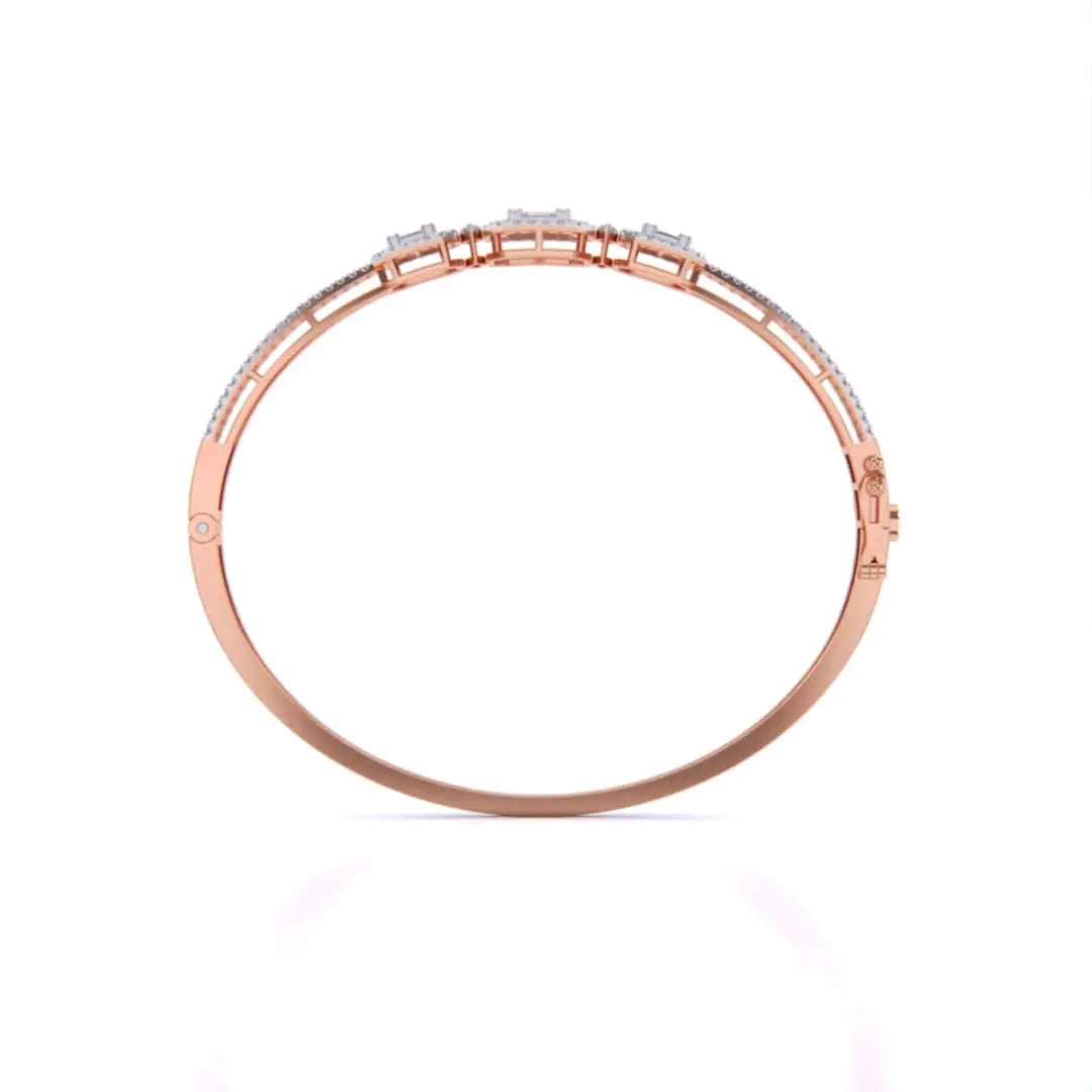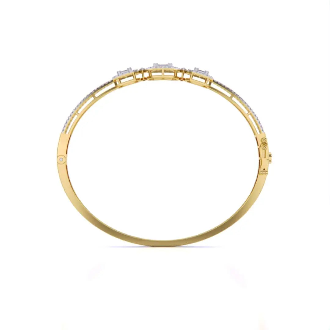 This striking baguette diamond bangle showcases the modern elegance of bezel setting, where each diamond is securely framed in precious metal for a polished, contemporary look. The linear arrangement of baguette stones creates a sleek silhouette that commands attention without excess. Versatile enough for daily wear yet refined enough for formal occasions, this bangle embodies understated luxury and timeless sophistication.