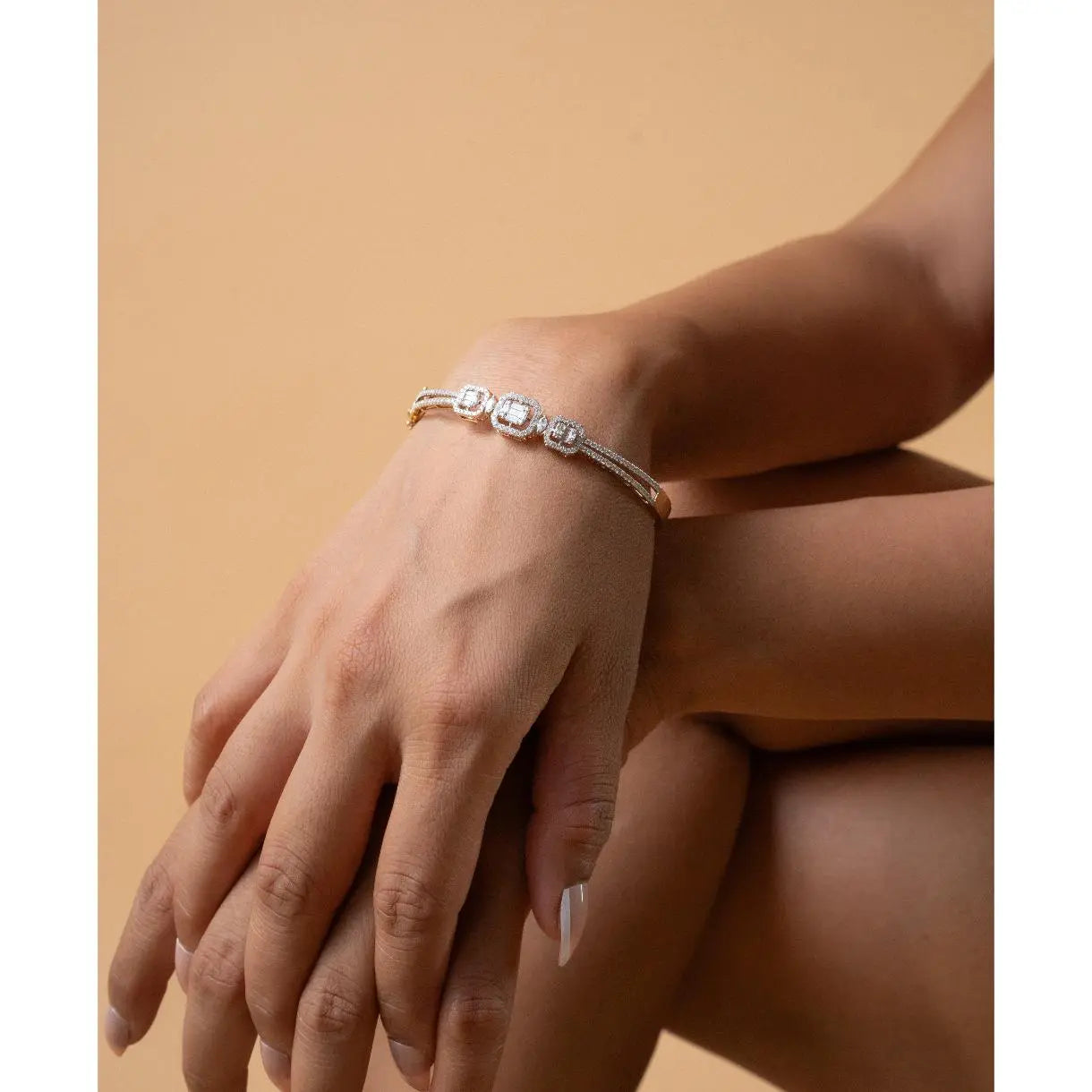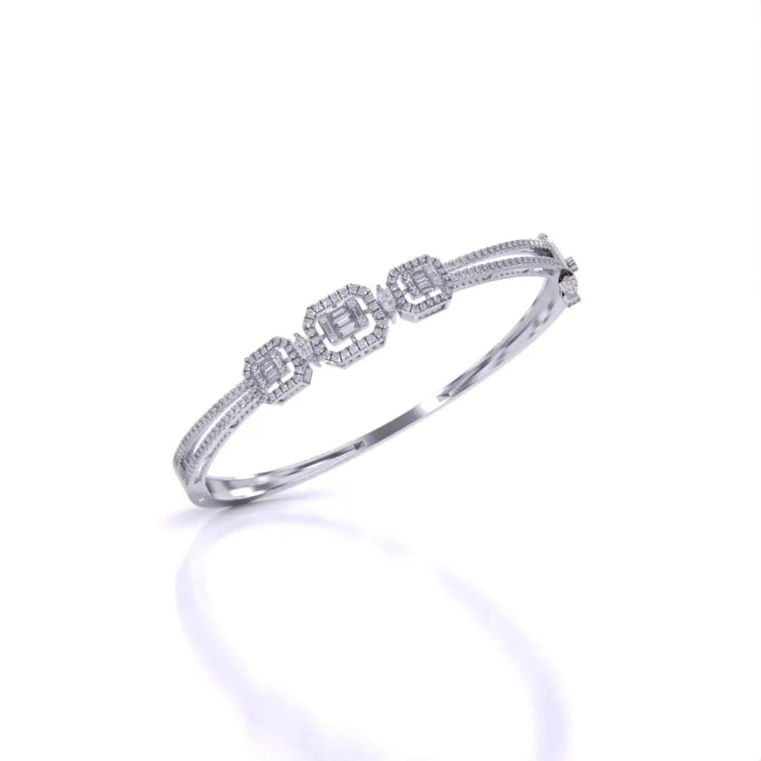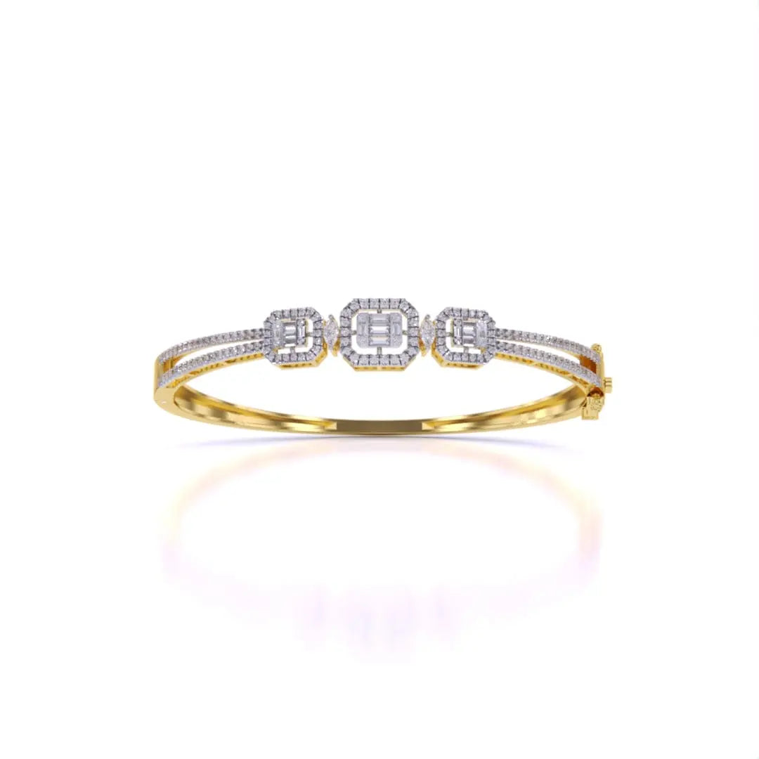 This striking baguette diamond bangle showcases the modern elegance of bezel setting, where each diamond is securely framed in precious metal for a polished, contemporary look. The linear arrangement of baguette stones creates a sleek silhouette that commands attention without excess. Versatile enough for daily wear yet refined enough for formal occasions, this bangle embodies understated luxury and timeless sophistication.