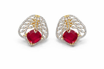 Cushion-Cut Ruby and Diamond Halo Leaf Filigree Stud Earrings