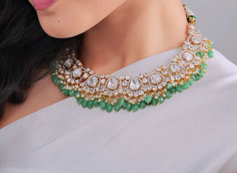 Elevate your bridal ensemble with this Dazzling Green Diamond Polki Necklace. Expertly crafted, this choker features exquisite Polki diamonds set to enhance the rich green hues, offering a timeless elegance perfect for special occasions. Its sophisticated design ensures a striking yet graceful statement, seamlessly blending tradition with refined luxury.