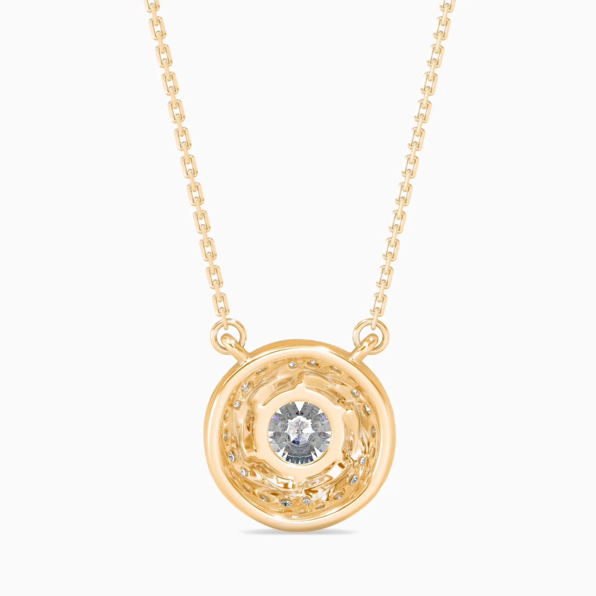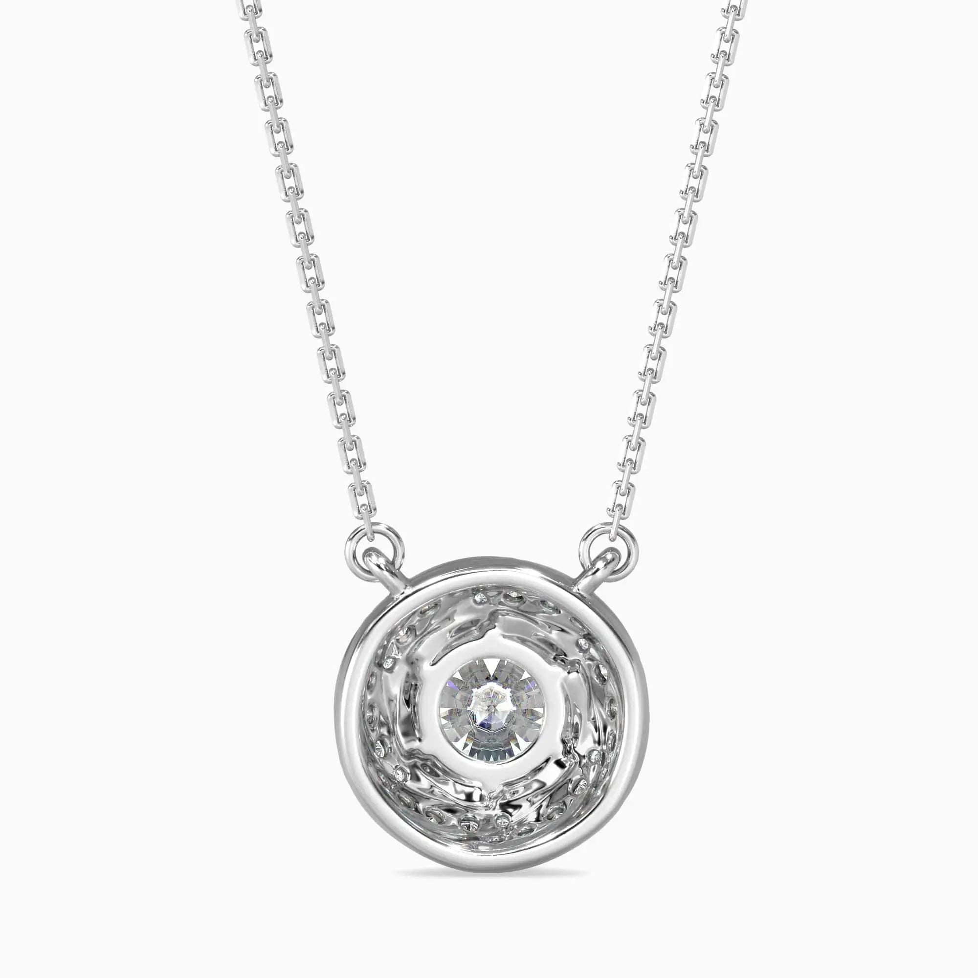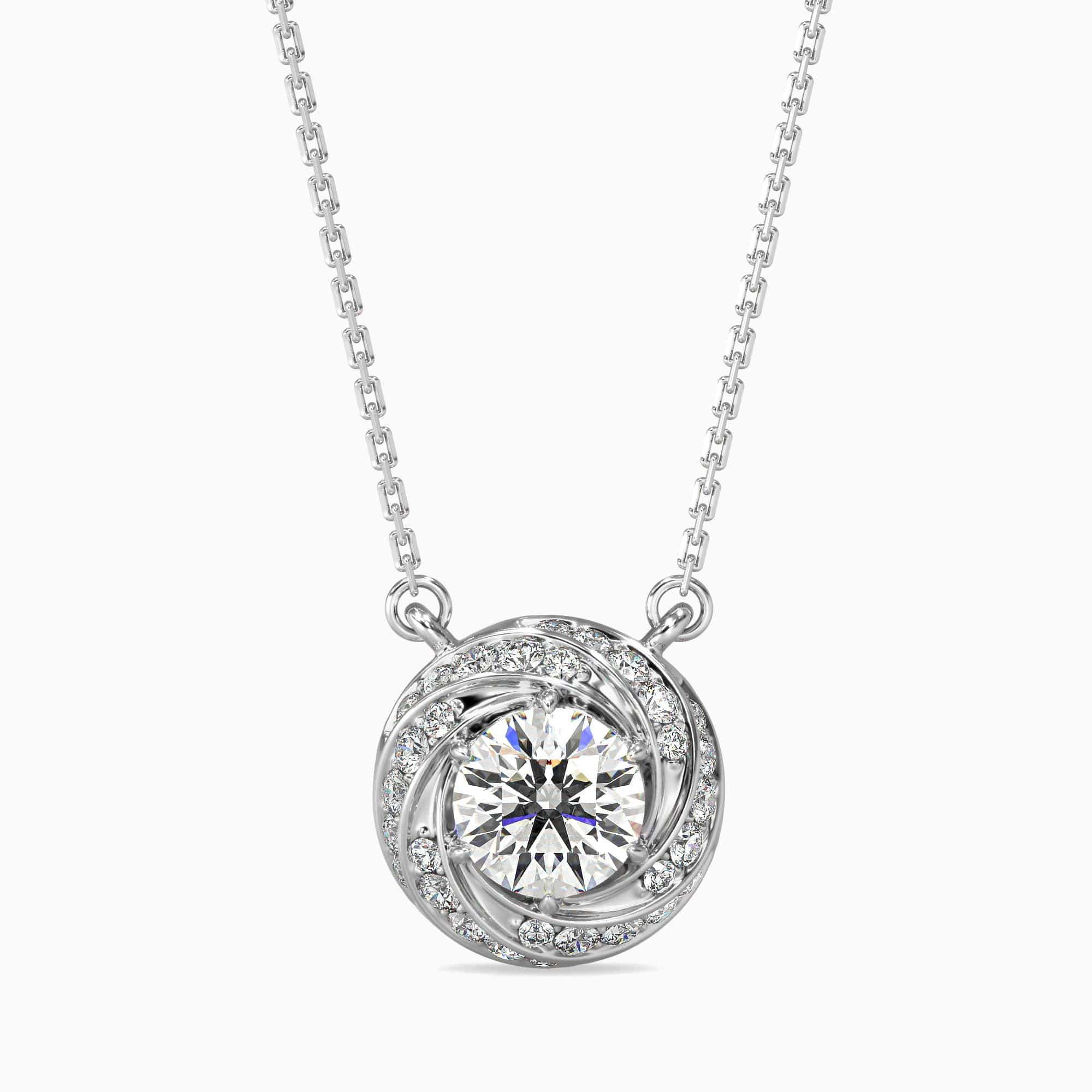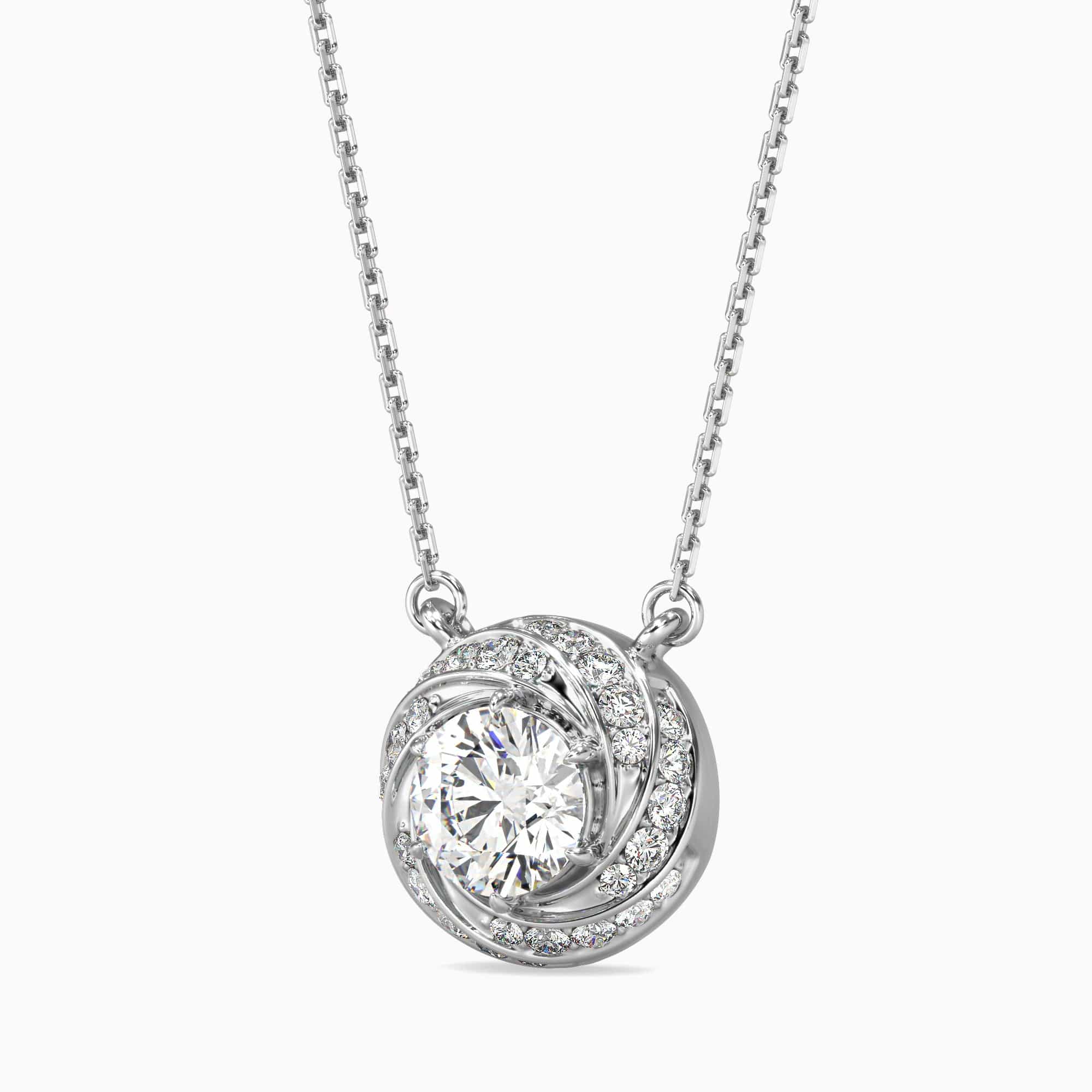 This 1 Carat Round Cut Solitaire Diamond pendant showcases a captivating swirl design, expertly crafted with a lab grown diamond known for its exceptional clarity and brilliance. Combining ethical sourcing with timeless sophistication, this pendant adds a refined sparkle to any ensemble, perfect for those who value elegance and sustainability.