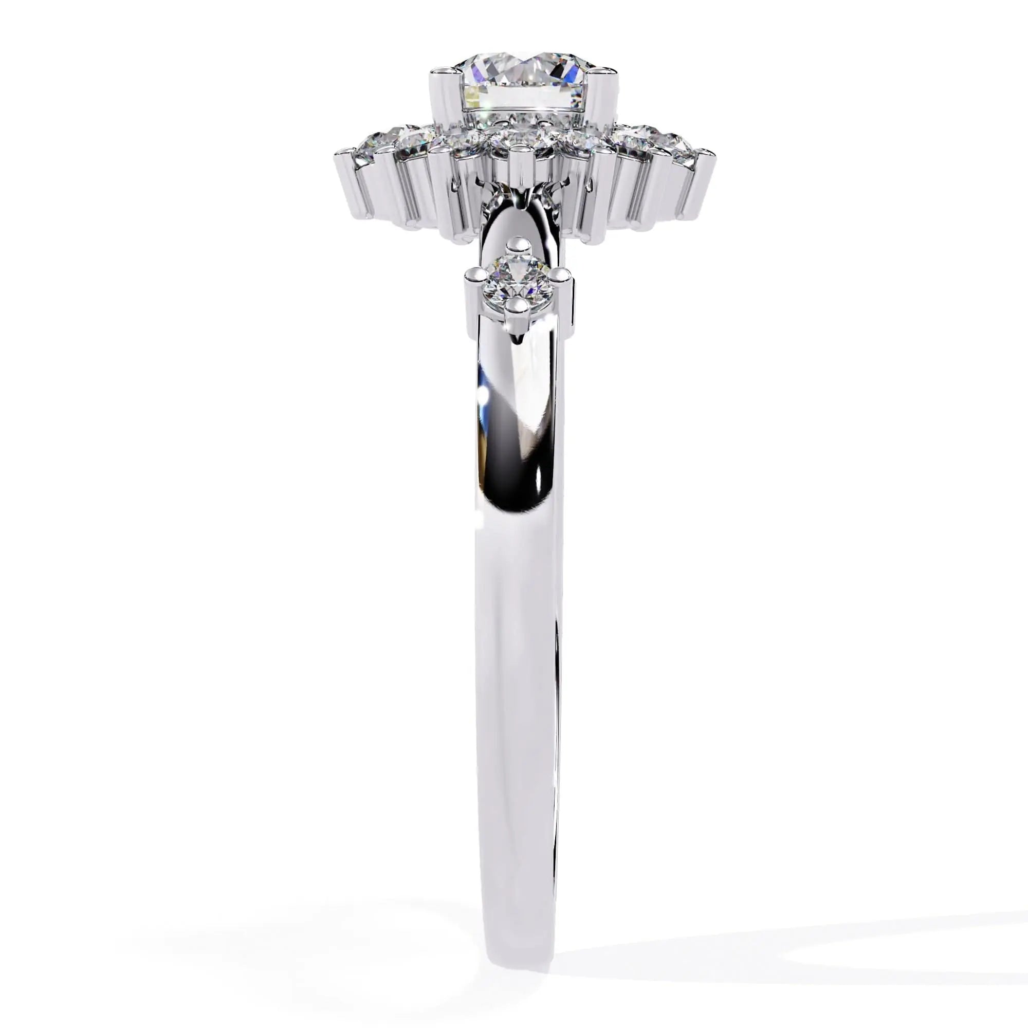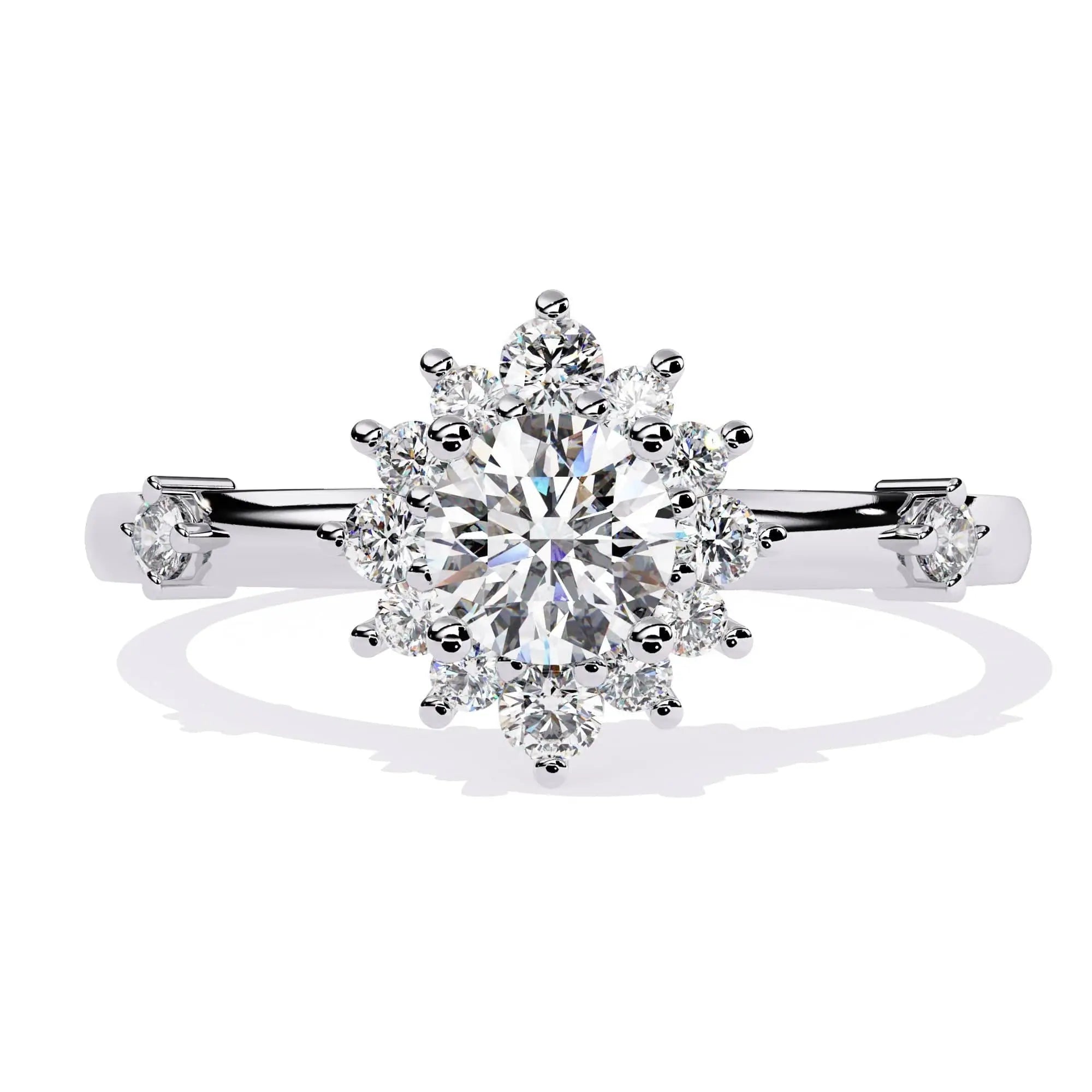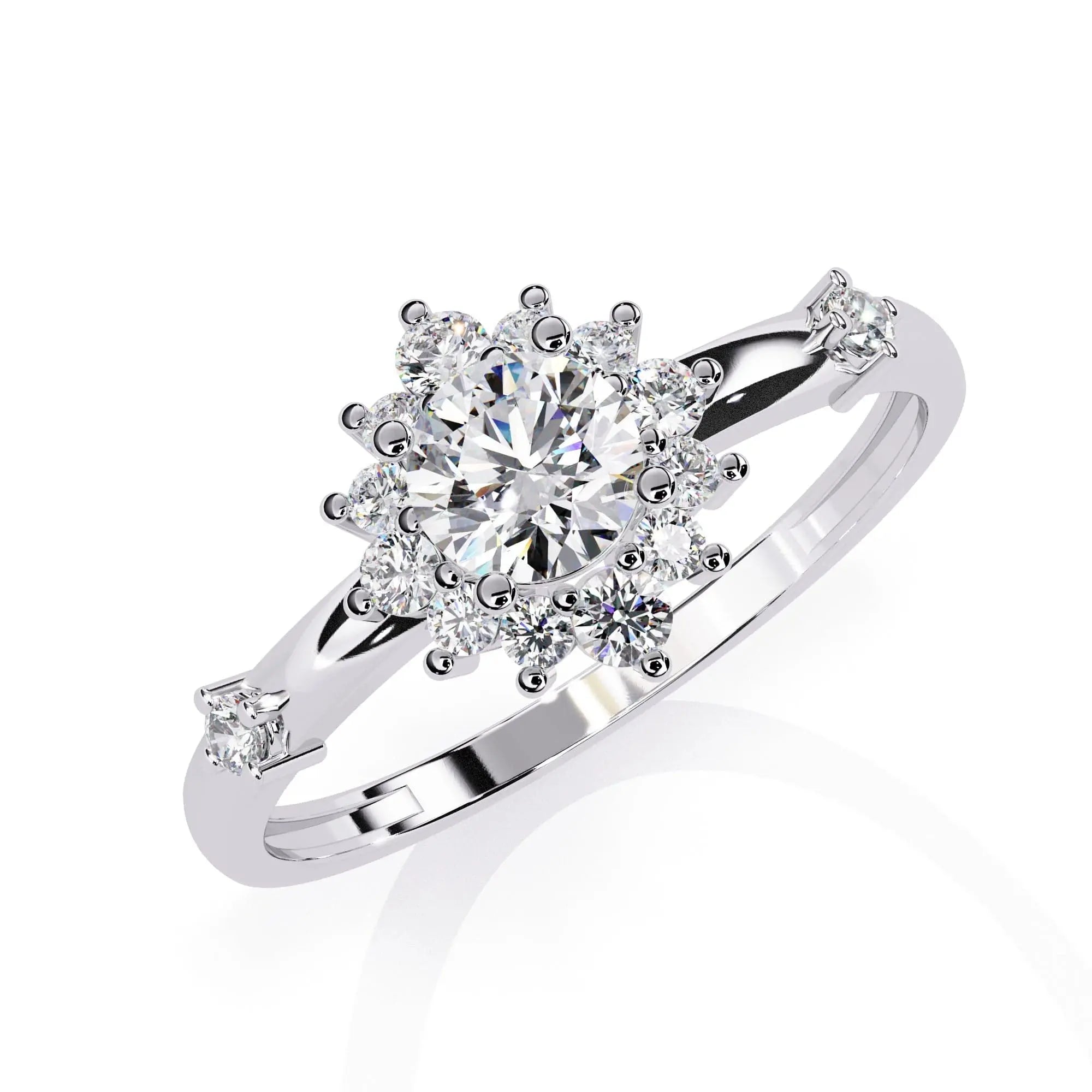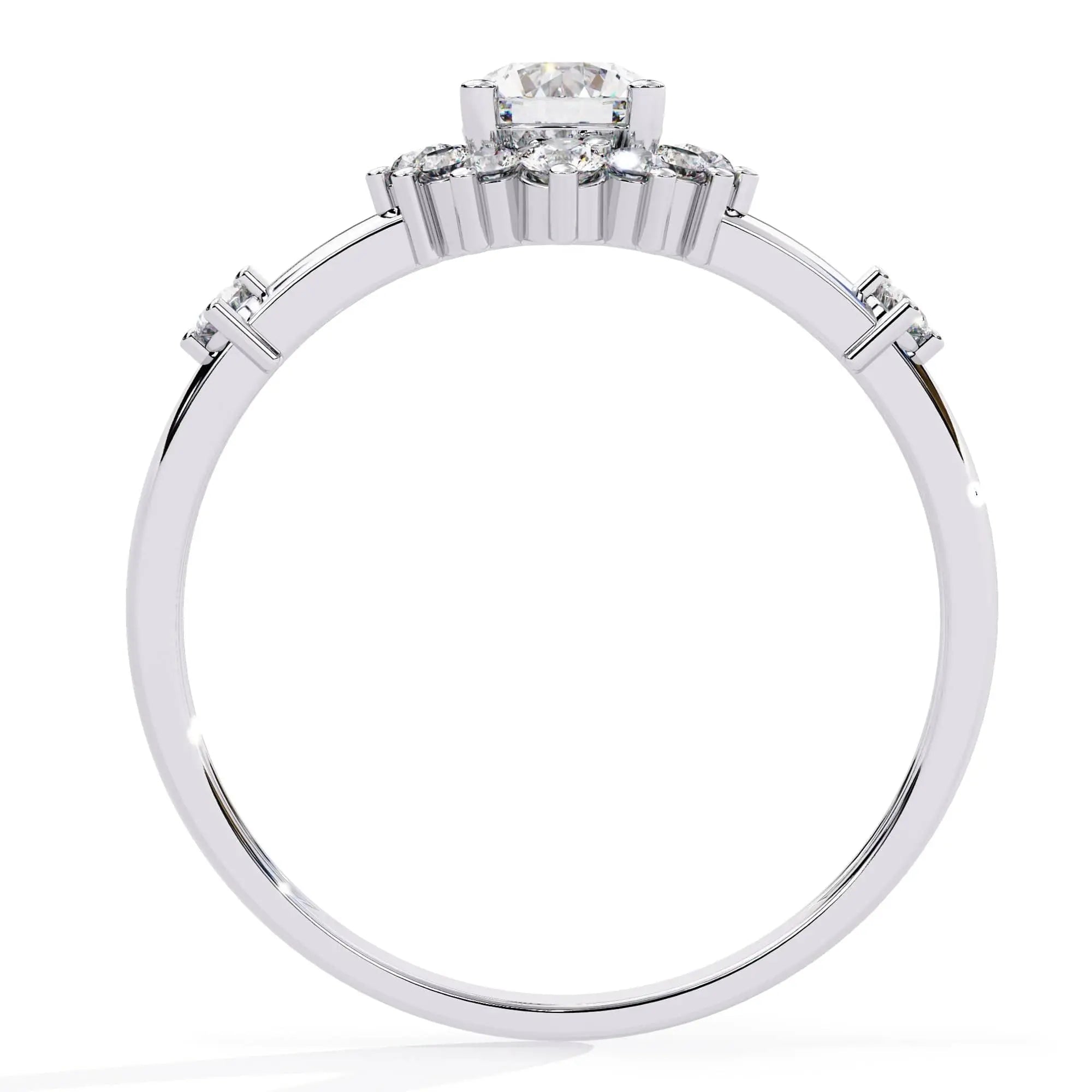 This Delicate Halo Diamond Engagement Ring showcases a brilliant lab grown diamond surrounded by a finely crafted halo setting. Designed for elegance and sustainability, it combines timeless sophistication with ethical craftsmanship, making it an exquisite choice for a meaningful symbol of love.