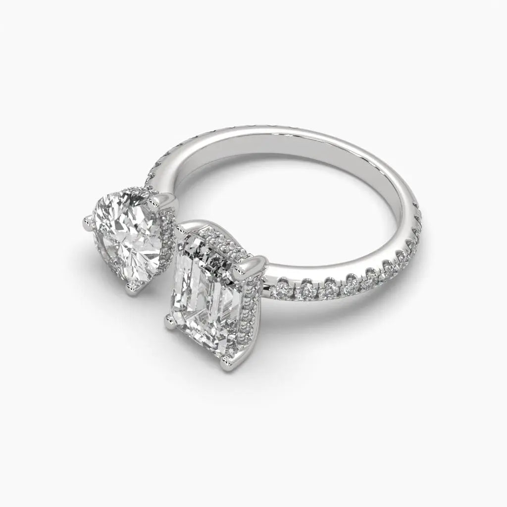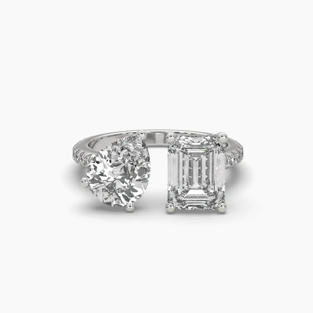 The Toi Et Moi Dual Delights Diamond Ring showcases a pear-shaped lab grown diamond alongside a rich emerald, blending modern sustainability with classic elegance. This sophisticated piece offers a unique balance of brilliance and color, perfect for those seeking refined style with an ethical touch.