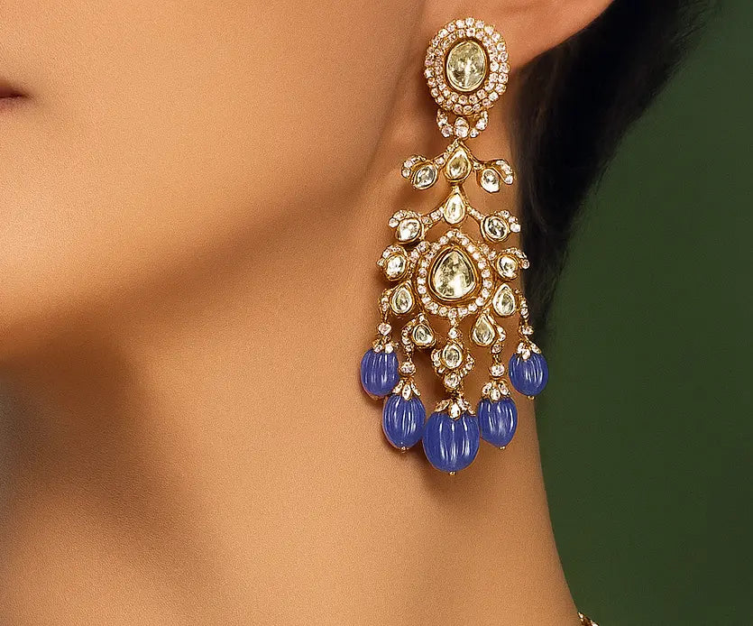 Elegant Blue Stone Polki Dangler Earrings, designed to celebrate your unique style. Each piece showcases authentic polki craftsmanship paired with mesmerizing royal blue stones that radiate sophistication. The delicate dangling silhouette adds graceful movement and dimension to your look, whether you're attending a festive celebration or elevating your everyday wear. These earrings are a versatile treasure that complements both traditional and modern outfits, bringing timeless beauty and cultural richness to your personal collection.