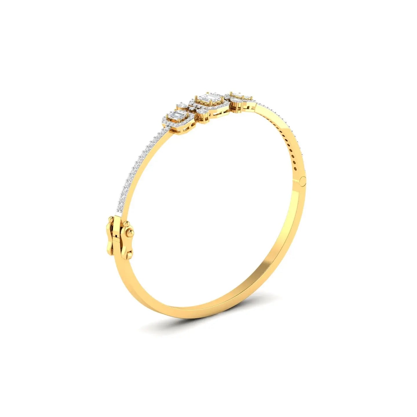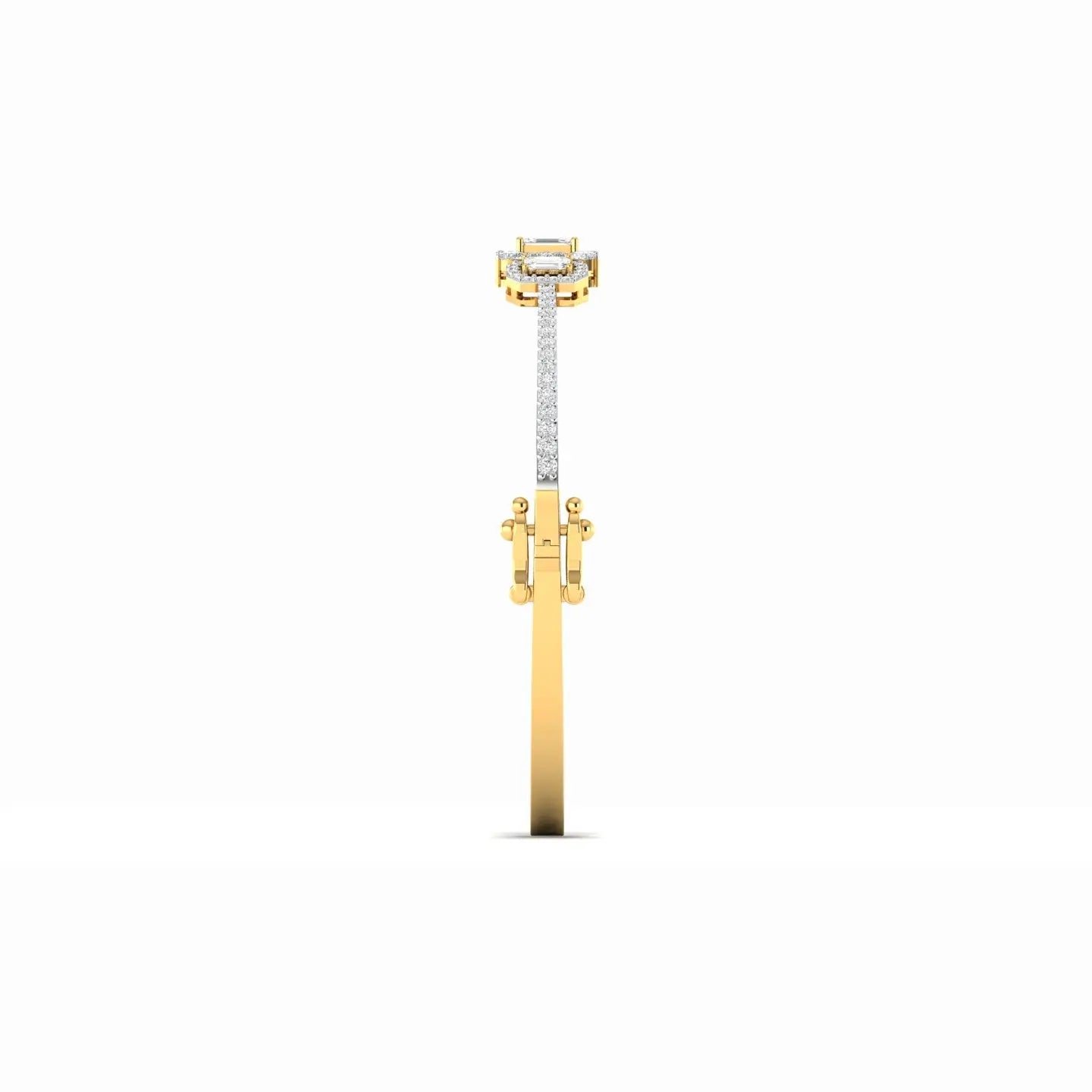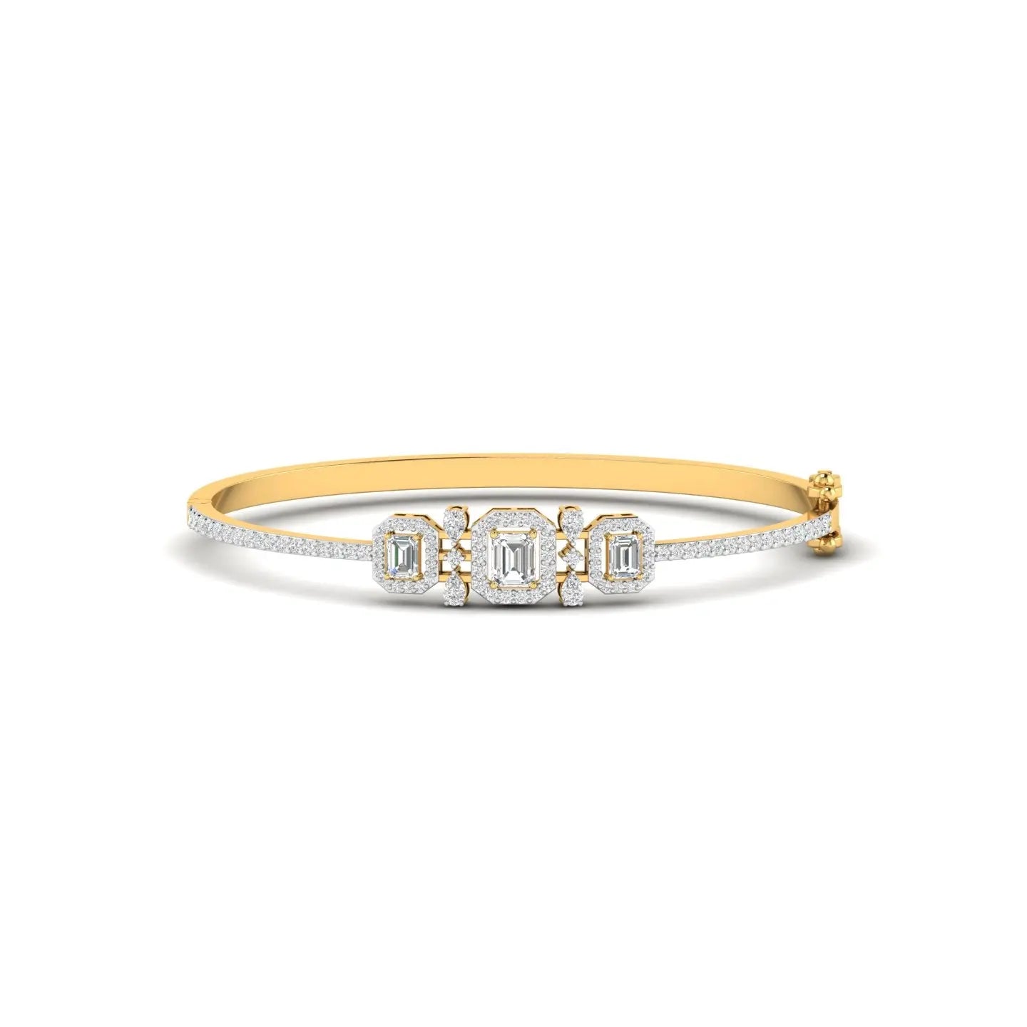Elevate your elegance with this Emerald Cut Diamond Cluster Bangle, featuring a stunning arrangement of three exquisite stones. The precise emerald cut diamonds showcase timeless sophistication, while the cluster design adds depth and brilliance to your wrist. This bangle seamlessly blends classic charm with modern luxury, making it a perfect choice for those who appreciate refined craftsmanship and enduring style.