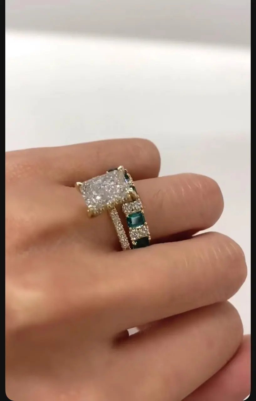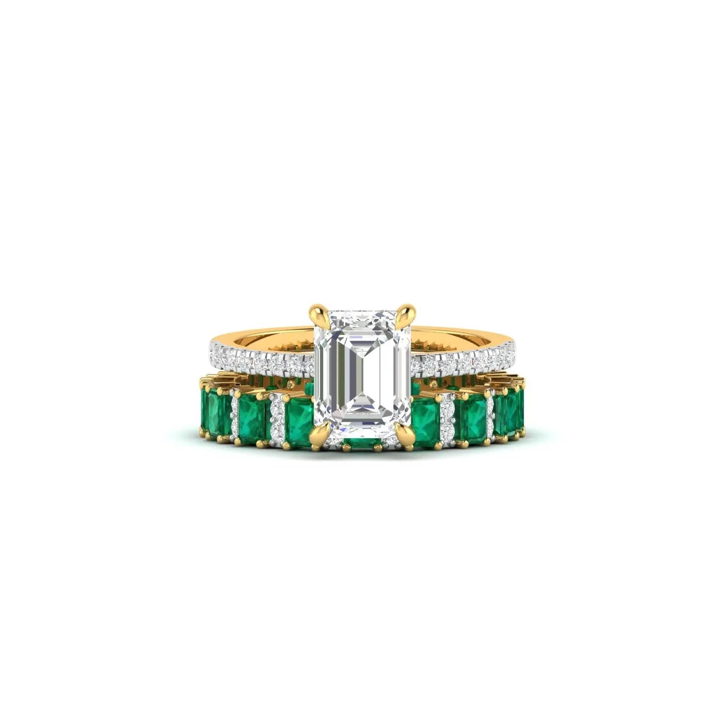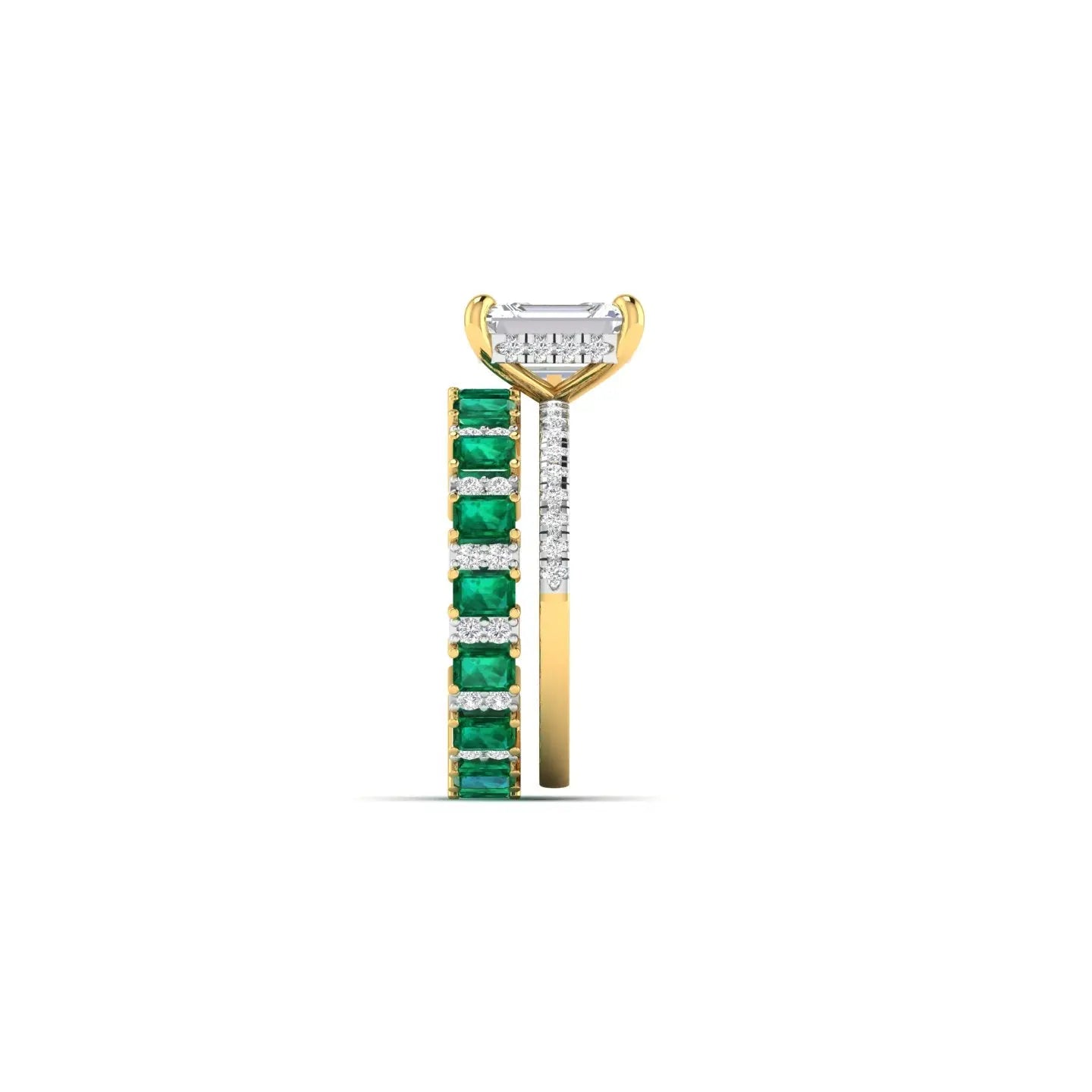 Each piece showcases the verdant allure of emerald stones harmoniously set with sparkling diamonds in luxurious gold. Our bridal ring sets are meticulously crafted to complement one another, creating a cohesive and radiant look for your special day. Whether you prefer a bold emerald centrepiece or delicate diamond accents, these rings embody timeless elegance and refined craftsmanship. Perfect for the discerning bride who values both beauty and distinction, our designs celebrate the profound symbolism of your commitment with understated luxury.