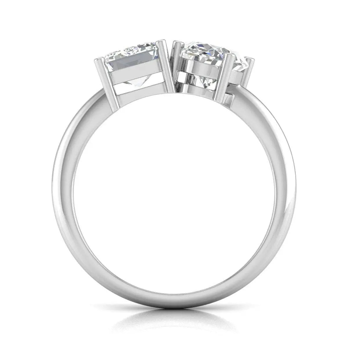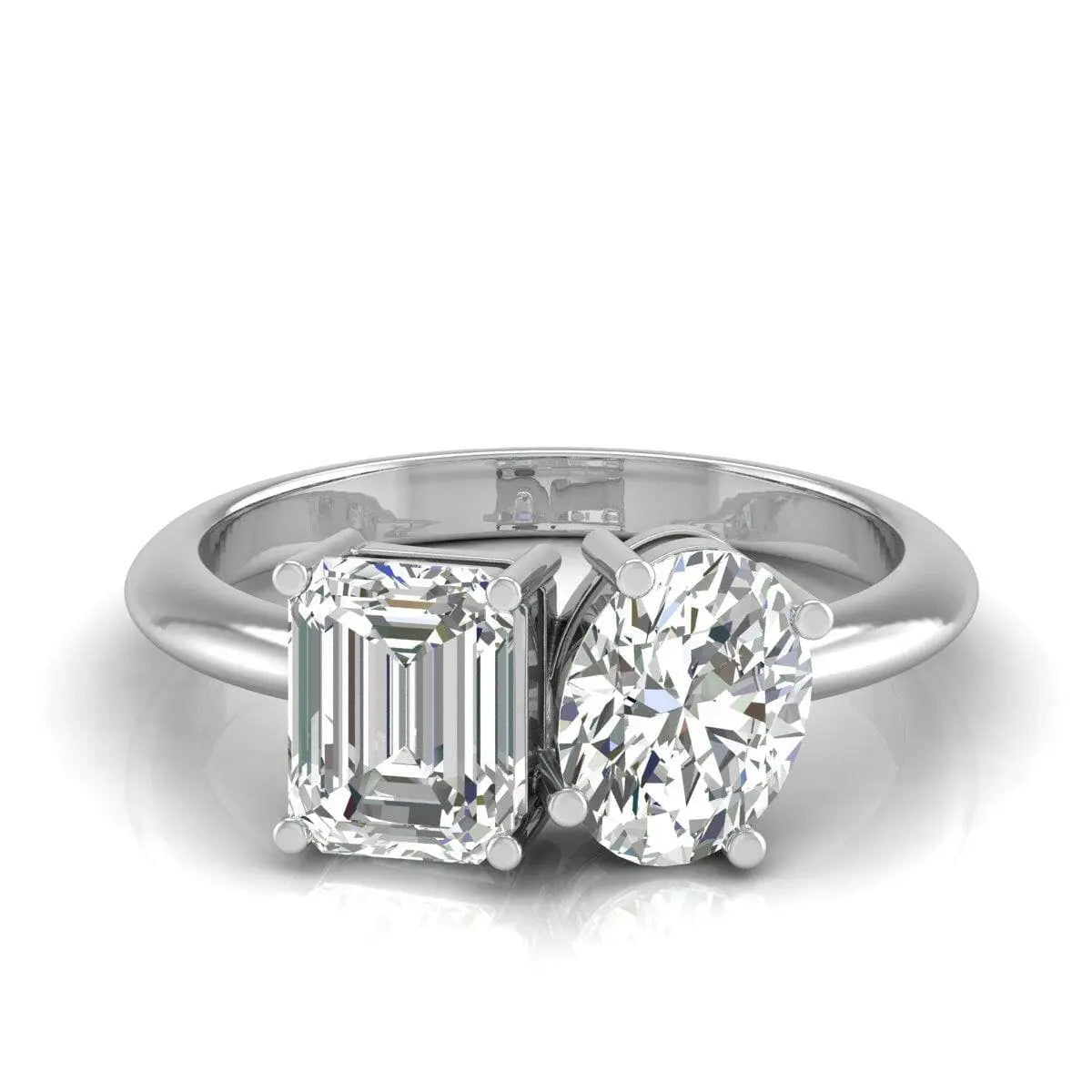 The Toi Et Moi Diamond Ring showcases a sophisticated design with lab grown emerald and oval diamonds paired elegantly side by side. This ethically crafted piece combines modern sustainability with timeless beauty, offering a refined symbol of connection and style. Perfect for those who value both exquisite craftsmanship and conscious luxury.