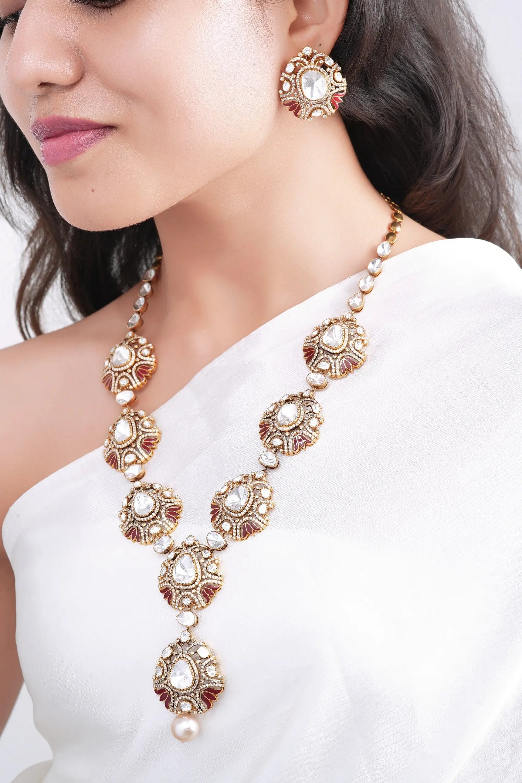 Celebrate timeless elegance with this stunning Enamelled Diamond Polki Necklace. Crafted with traditional polki diamonds set in a lustrous metal base, this piece combines heritage craftsmanship with contemporary design. The delicate enamel work adds vibrant color and intricate detailing, making it perfect for weddings, festivals, or special occasions. Each necklace is designed to be a cherished heirloom that brings grace and sophistication to your jewelry collection. Wear it with confidence and let its radiant beauty speak for itself.