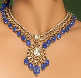 Discover the captivating charm of this Blur Stone Polki Diamond Necklace, where traditional artistry meets modern elegance. Each piece showcases exquisite polki diamonds nestled within a beautifully designed blur stone setting, creating a mesmerizing play of light and shadow. This versatile necklace effortlessly transitions from festive celebrations to intimate gatherings, making it an essential treasure for those who appreciate fine jewelry. Wear it with confidence, knowing you're adorned with a piece that honors heritage while expressing your distinctive taste and refinement.