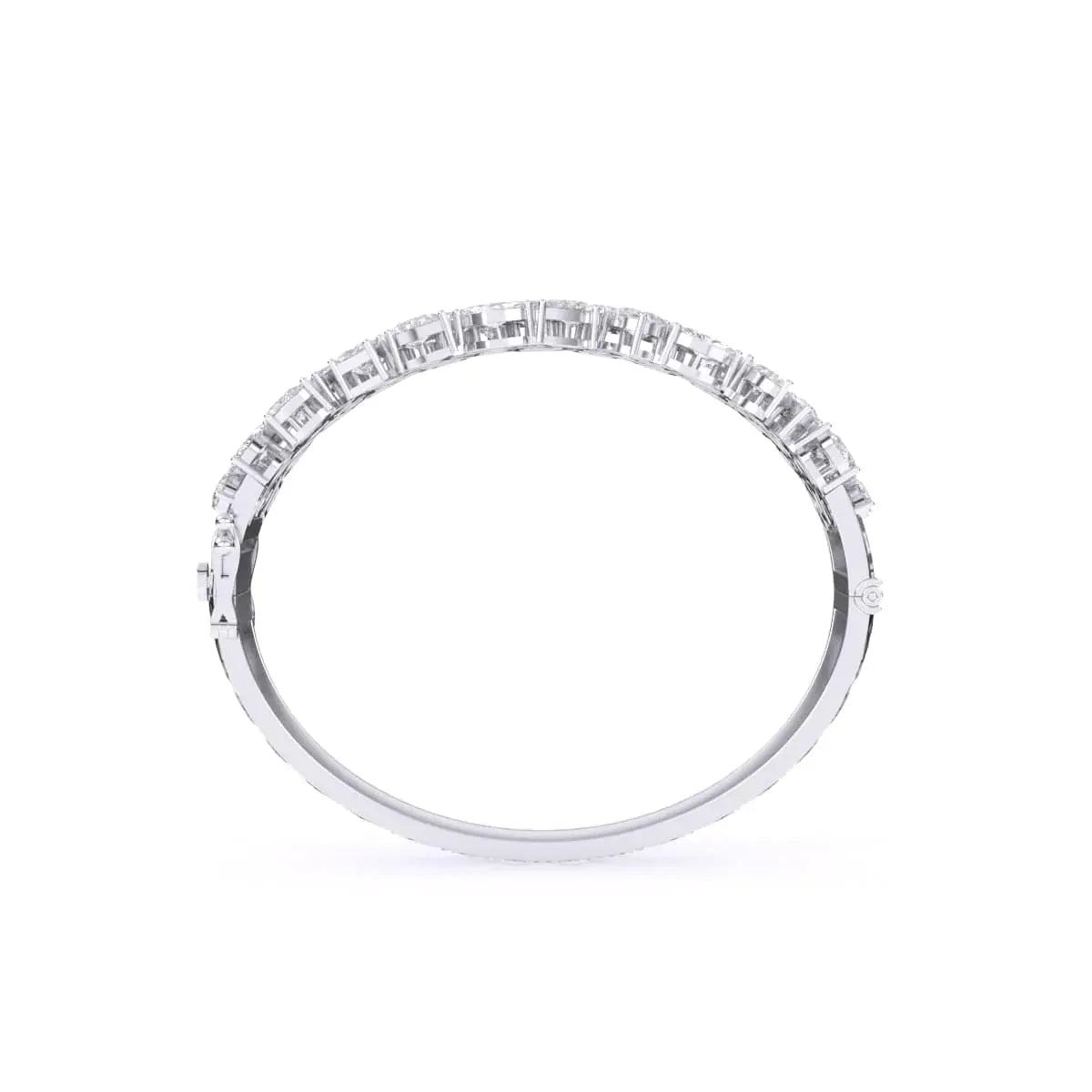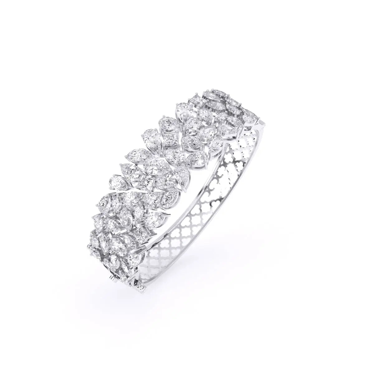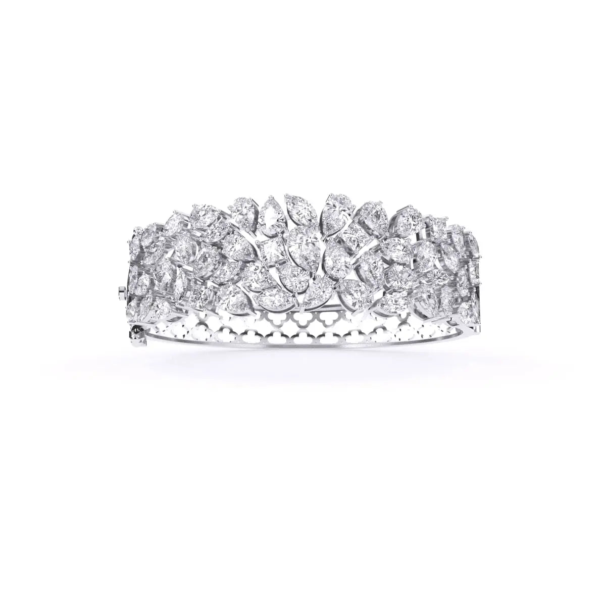 The Glorious Floral Diamond Bangle showcases the brilliance of lab grown diamonds set in an elegant floral motif. This sophisticated piece offers a sustainable alternative without compromising on sparkle, making it an exquisite choice for those who appreciate refined beauty and ethical luxury. Perfect for adding a touch of grace to any occasion.