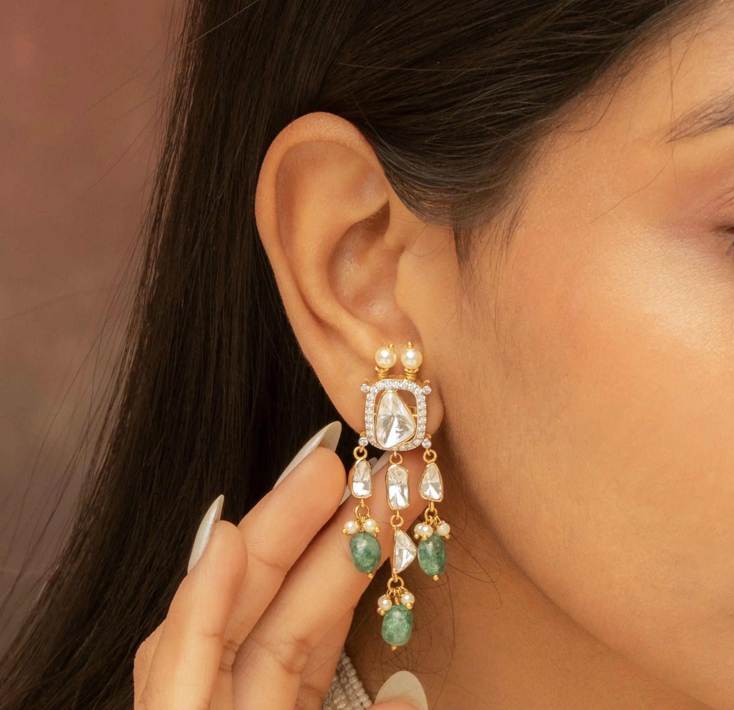 The Elite Emerald Polki Diamond Earrings showcase the brilliance of lab grown diamonds, combining ethical craftsmanship with timeless elegance. Their refined design, inspired by the rich hues of emeralds, offers a sophisticated accessory that enhances any ensemble with subtle luxury and responsible beauty.