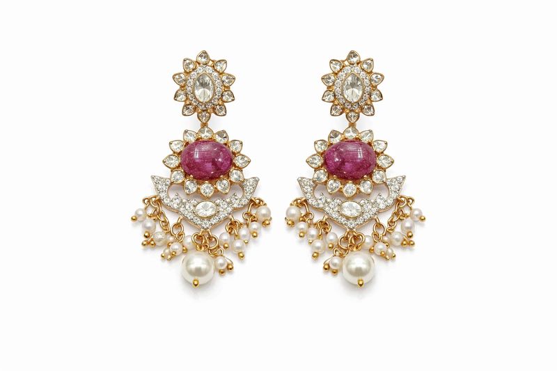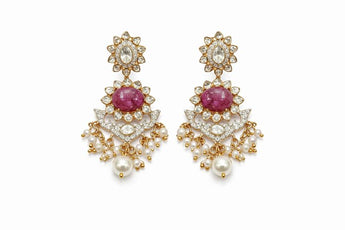 Grand 14K Gold Polki & Ruby Chandelier Earrings with Pearl Drops