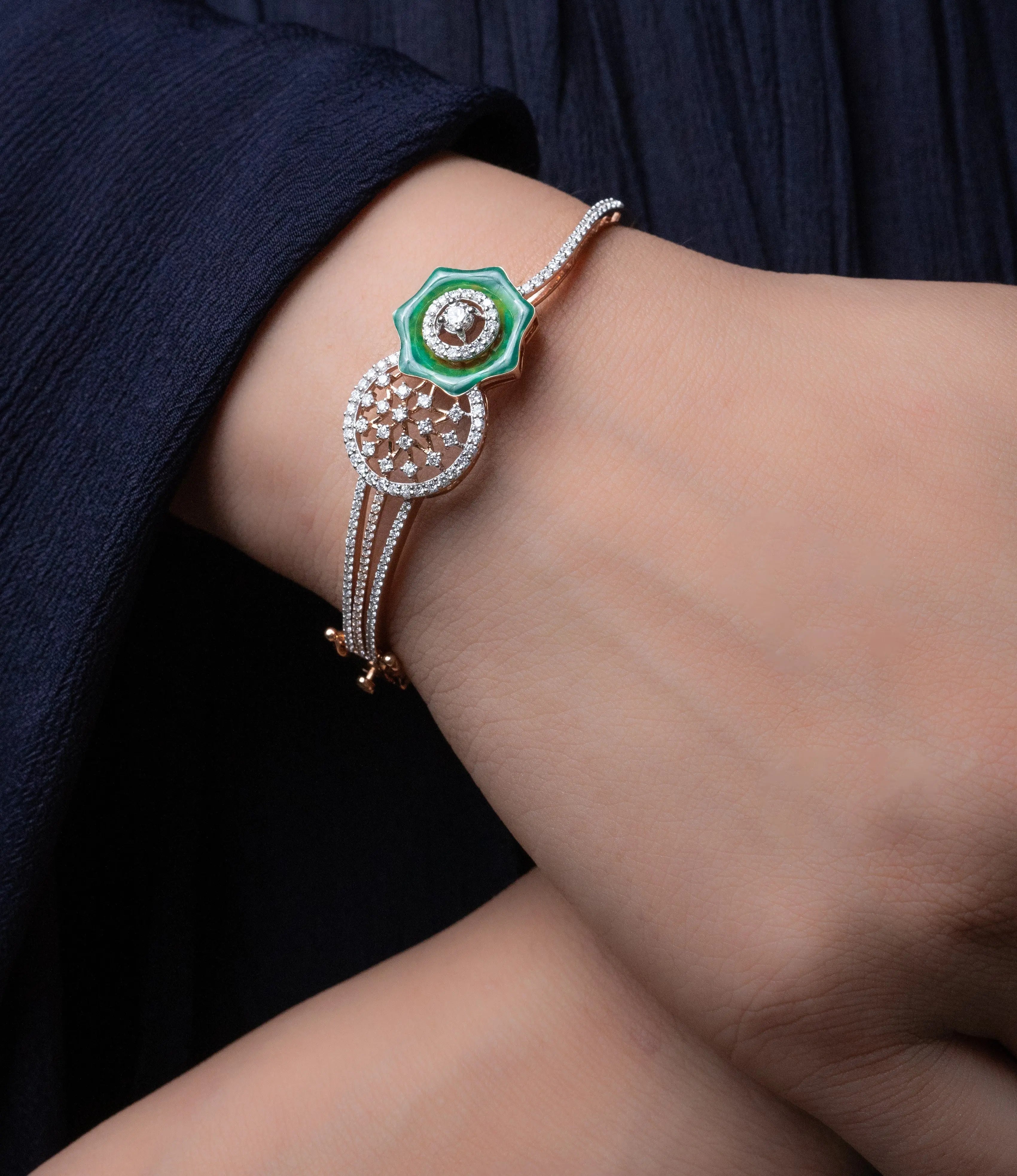 This Enticing Green Enamel and Diamond Bracelet combines the brilliance of lab grown diamonds with a striking green enamel design. Crafted for women who value elegance and sustainability, it offers a sophisticated accessory that enhances any outfit with a touch of modern luxury.