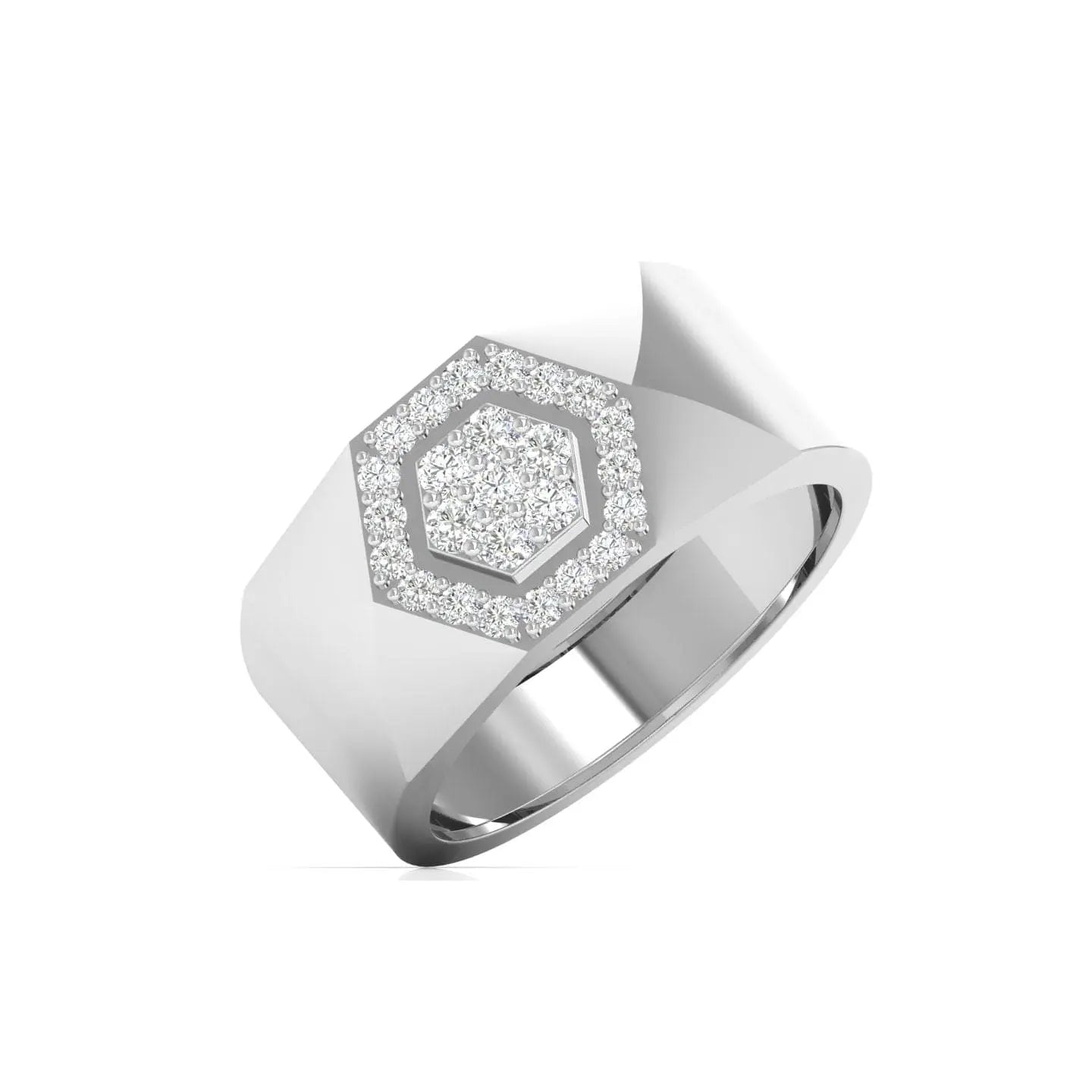 The Hexagon Halo Men's Ring showcases a brilliant lab grown diamond set within a distinctive hexagonal halo design. Crafted with precision, this ring offers a sophisticated blend of contemporary style and ethical luxury, perfect for the modern man who appreciates elegance and responsible sourcing.