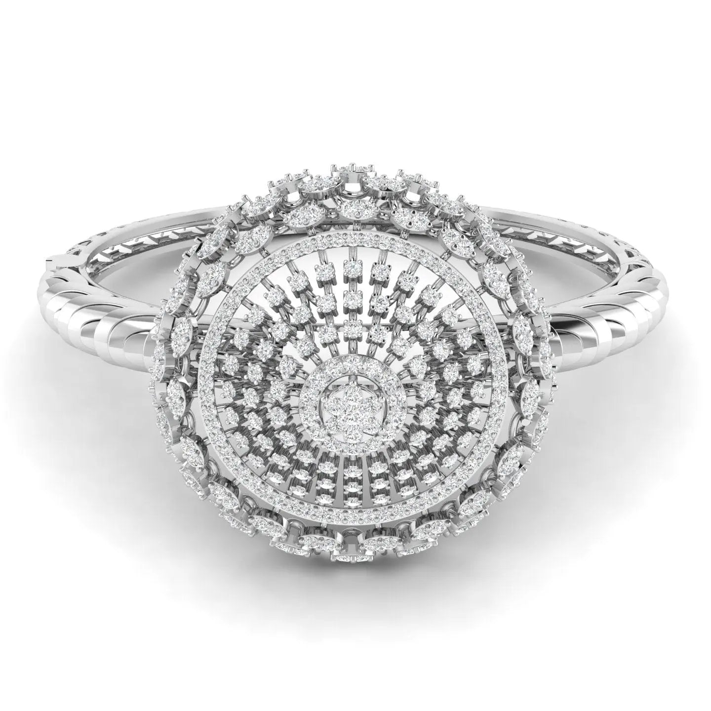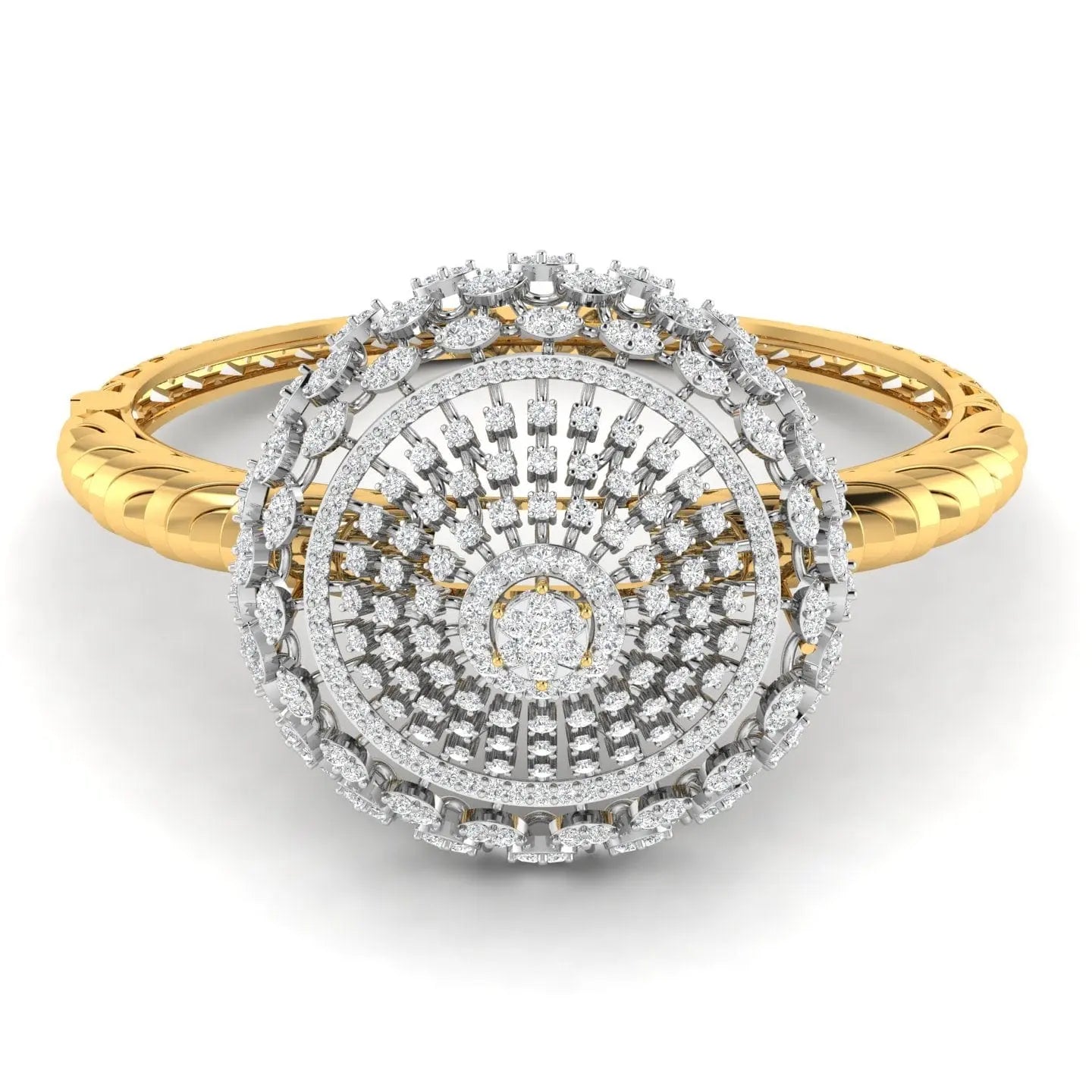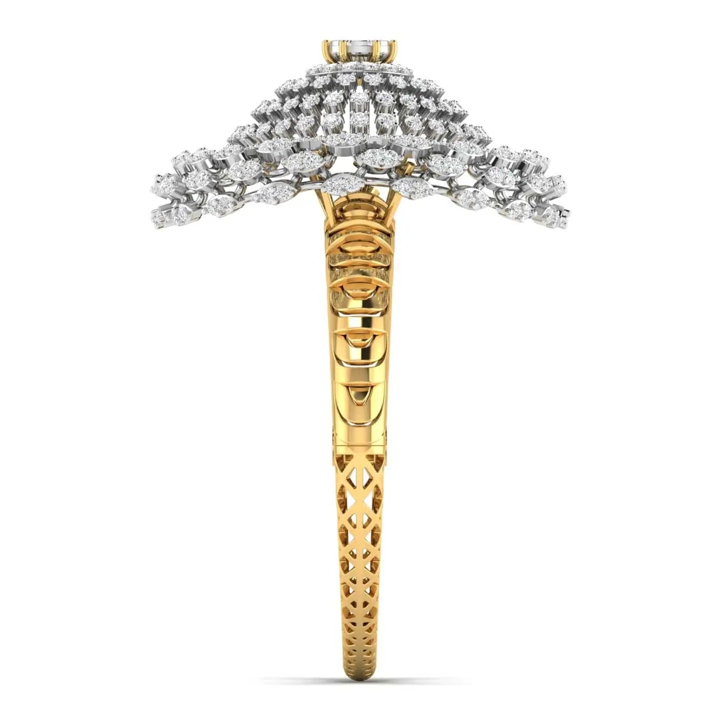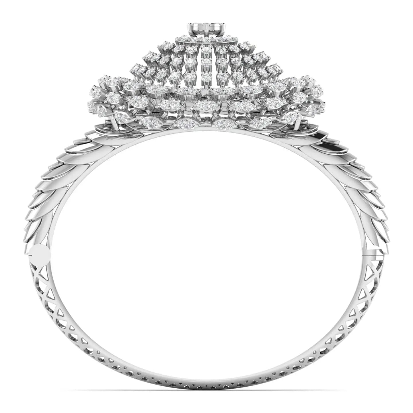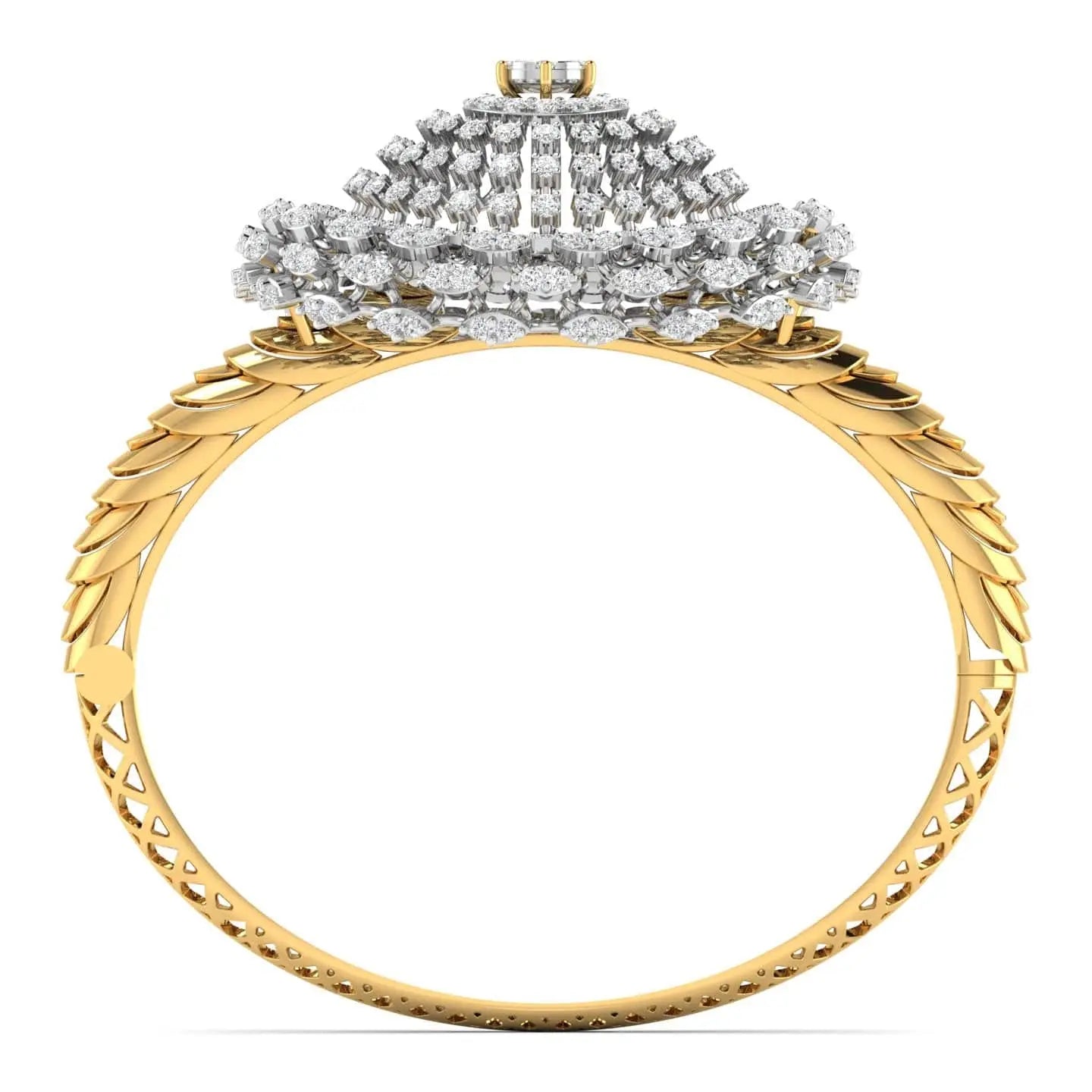 Celebrate your most cherished moments with this stunning bridal bangle, where intricate craftsmanship meets radiant beauty. Adorned with precisely set diamonds that dance across lustrous gold, each detail has been thoughtfully designed to complement your wedding day elegance. The bangle's sophisticated construction ensures both comfort and durability, making it a treasured heirloom piece for generations to come. A symbol of timeless commitment, this bracelet elevates any bridal ensemble with its refined glamour and exceptional sparkle.