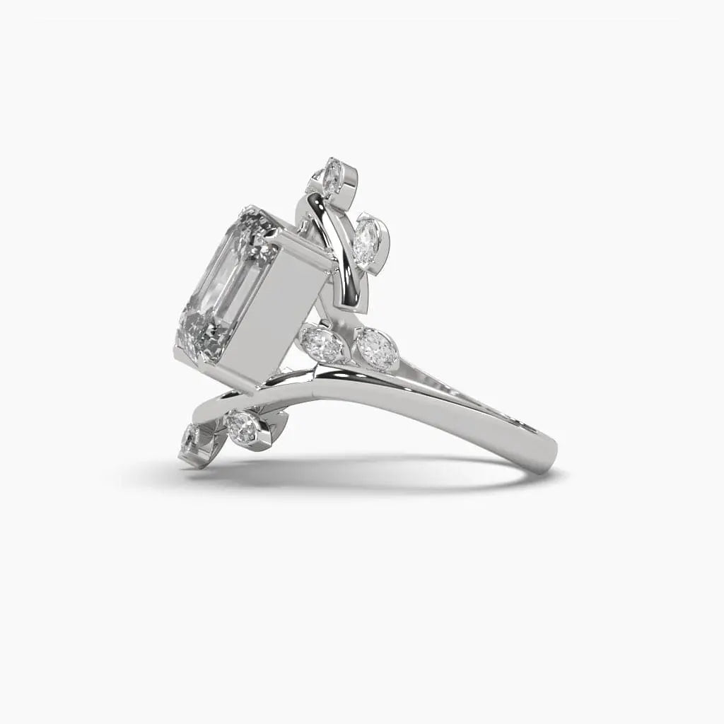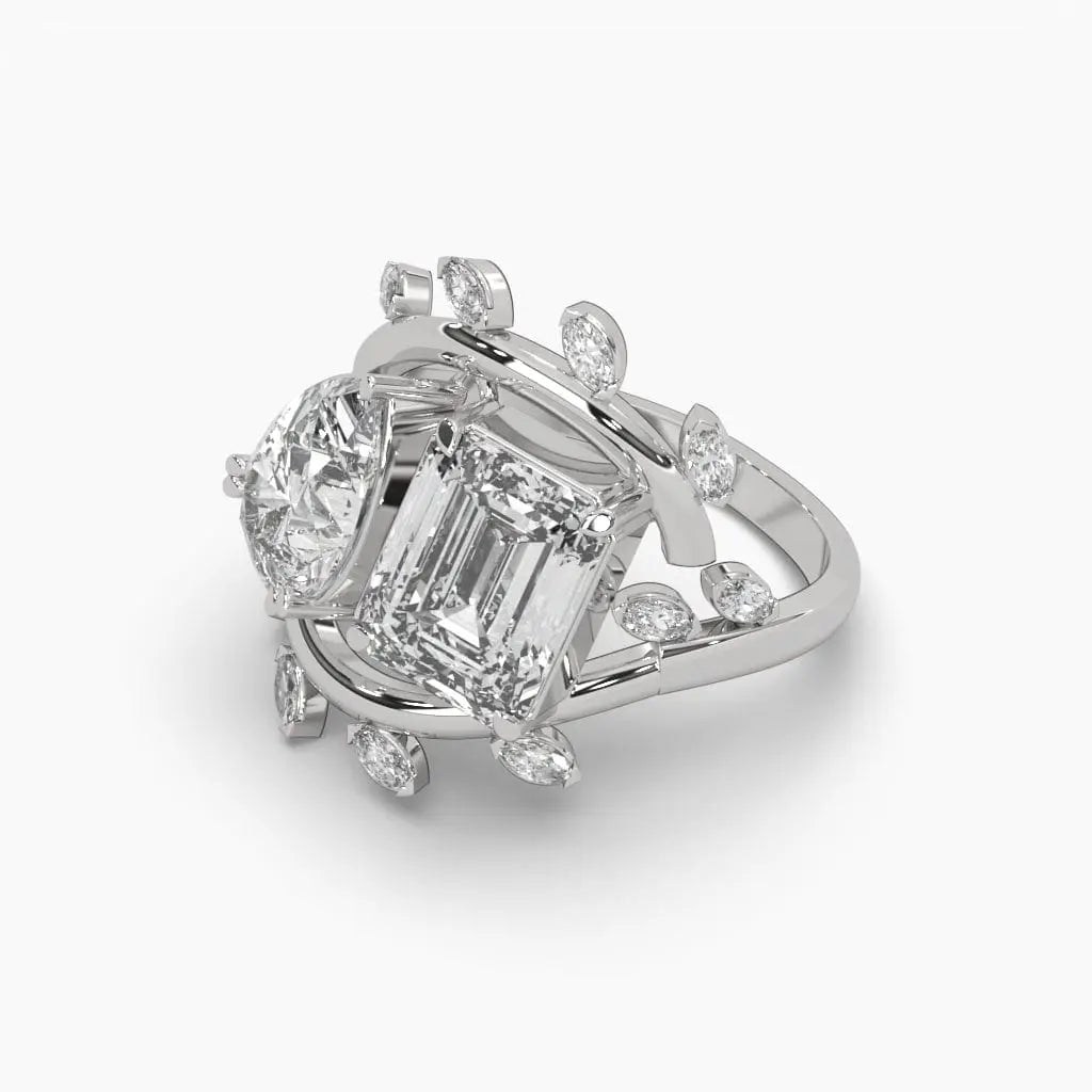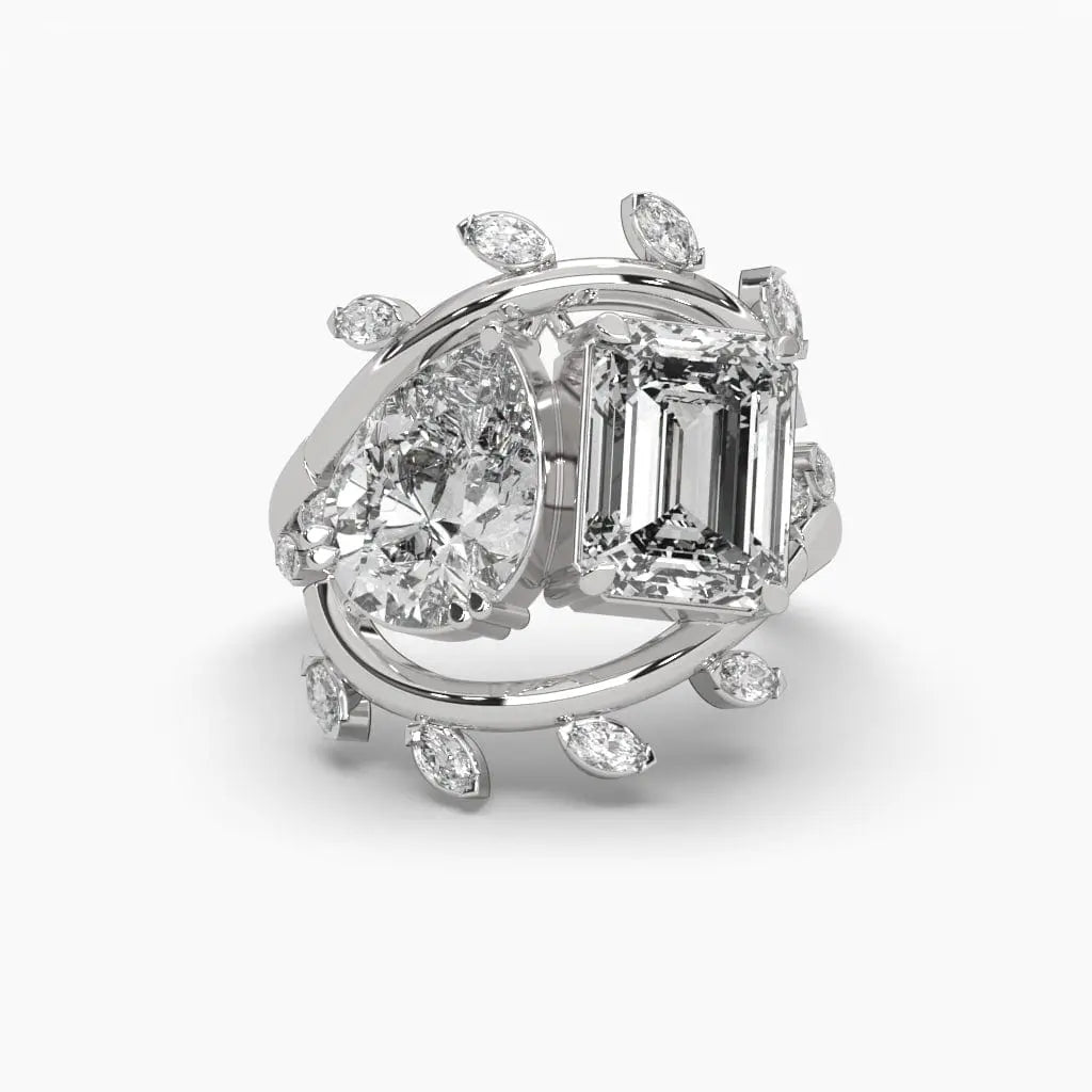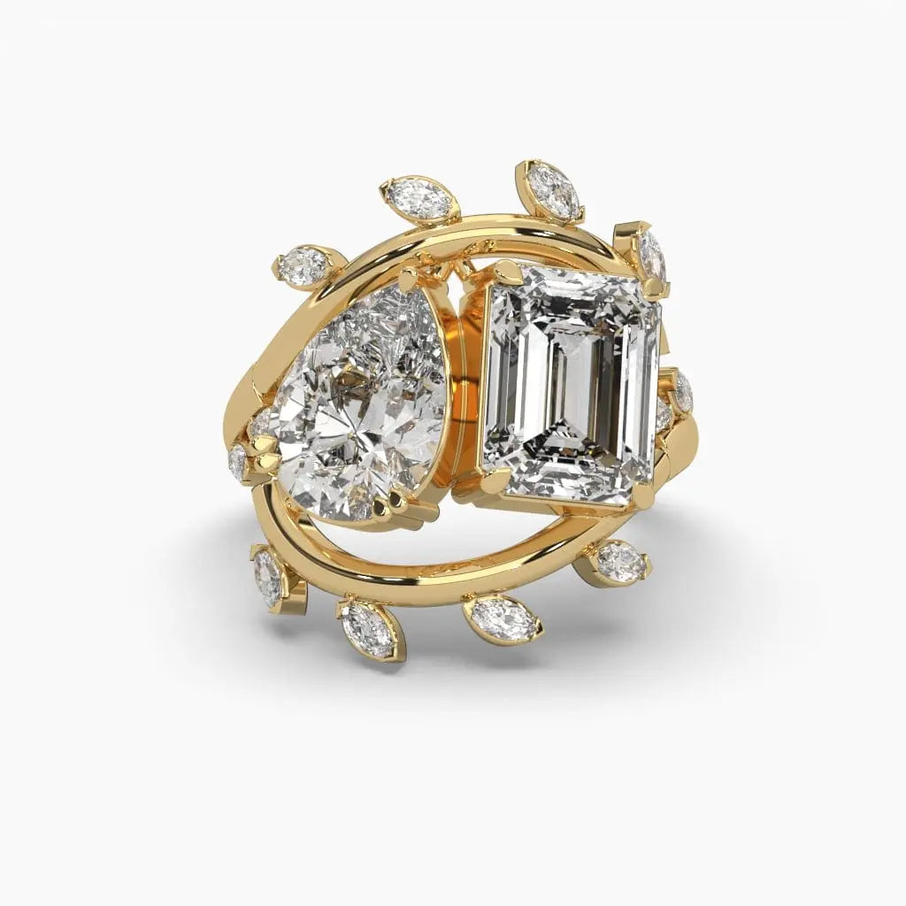 The Toi Et Moi Solitaire Vine Diamond Ring showcases a pear-shaped lab grown diamond alongside a vibrant emerald, set in an elegant vine-inspired design. This sophisticated piece blends sustainable luxury with timeless style, perfect for those who value refined craftsmanship and meaningful symbolism.