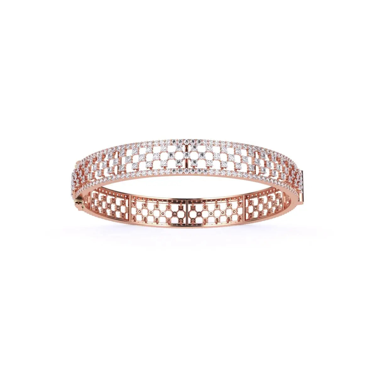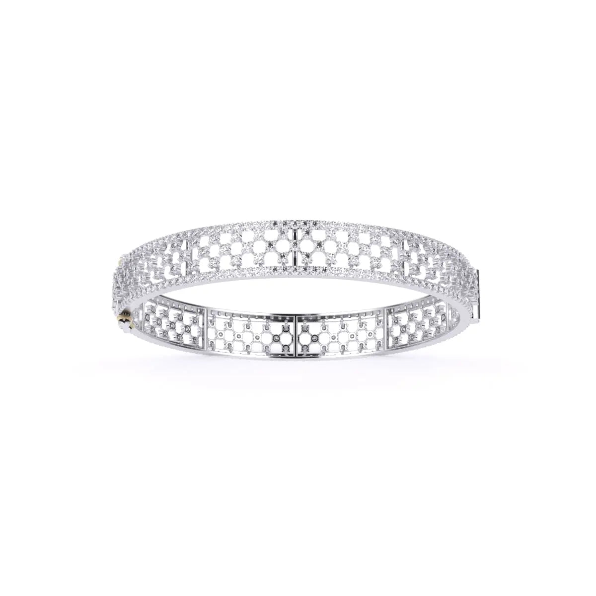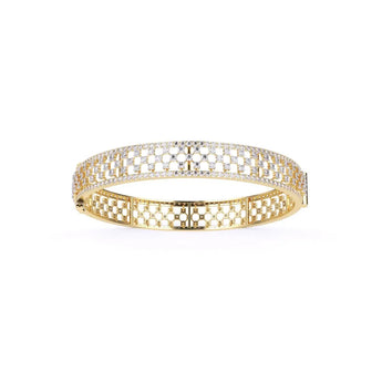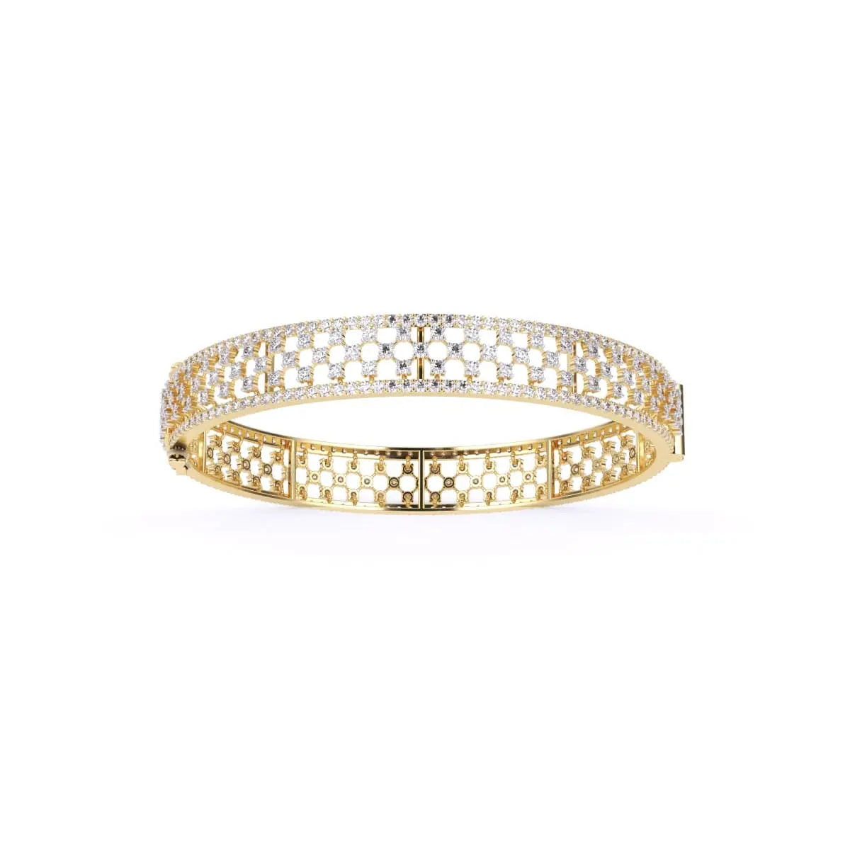 This Lattice Design Gold Diamond Bangle showcases the brilliance of lab grown diamonds set within an intricate lattice framework. Combining ethical craftsmanship with elegant design, it offers a sophisticated accessory that enhances any outfit with a subtle yet striking shimmer. Ideal for those who value both style and sustainability.
