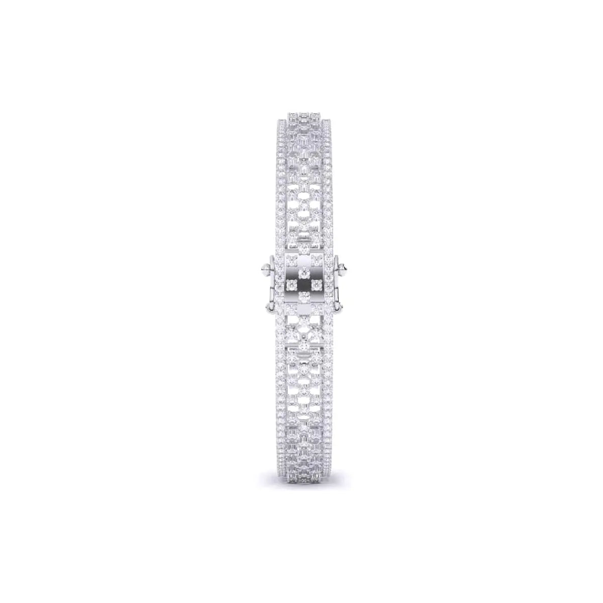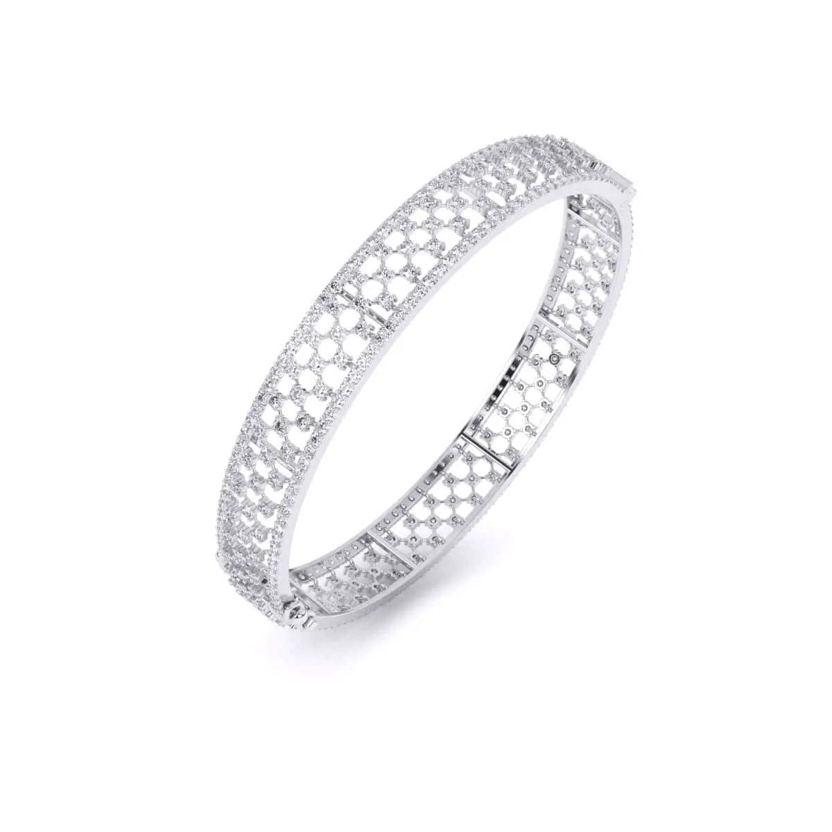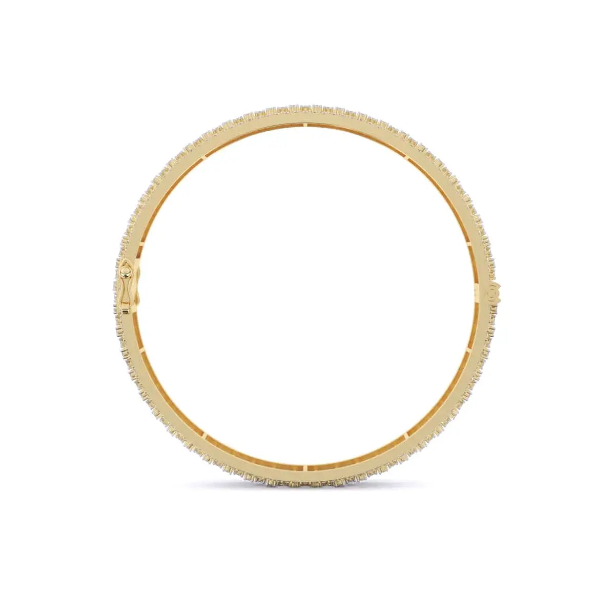 This Lattice Design Gold Diamond Bangle showcases the brilliance of lab grown diamonds set within an intricate lattice framework. Combining ethical craftsmanship with elegant design, it offers a sophisticated accessory that enhances any outfit with a subtle yet striking shimmer. Ideal for those who value both style and sustainability.