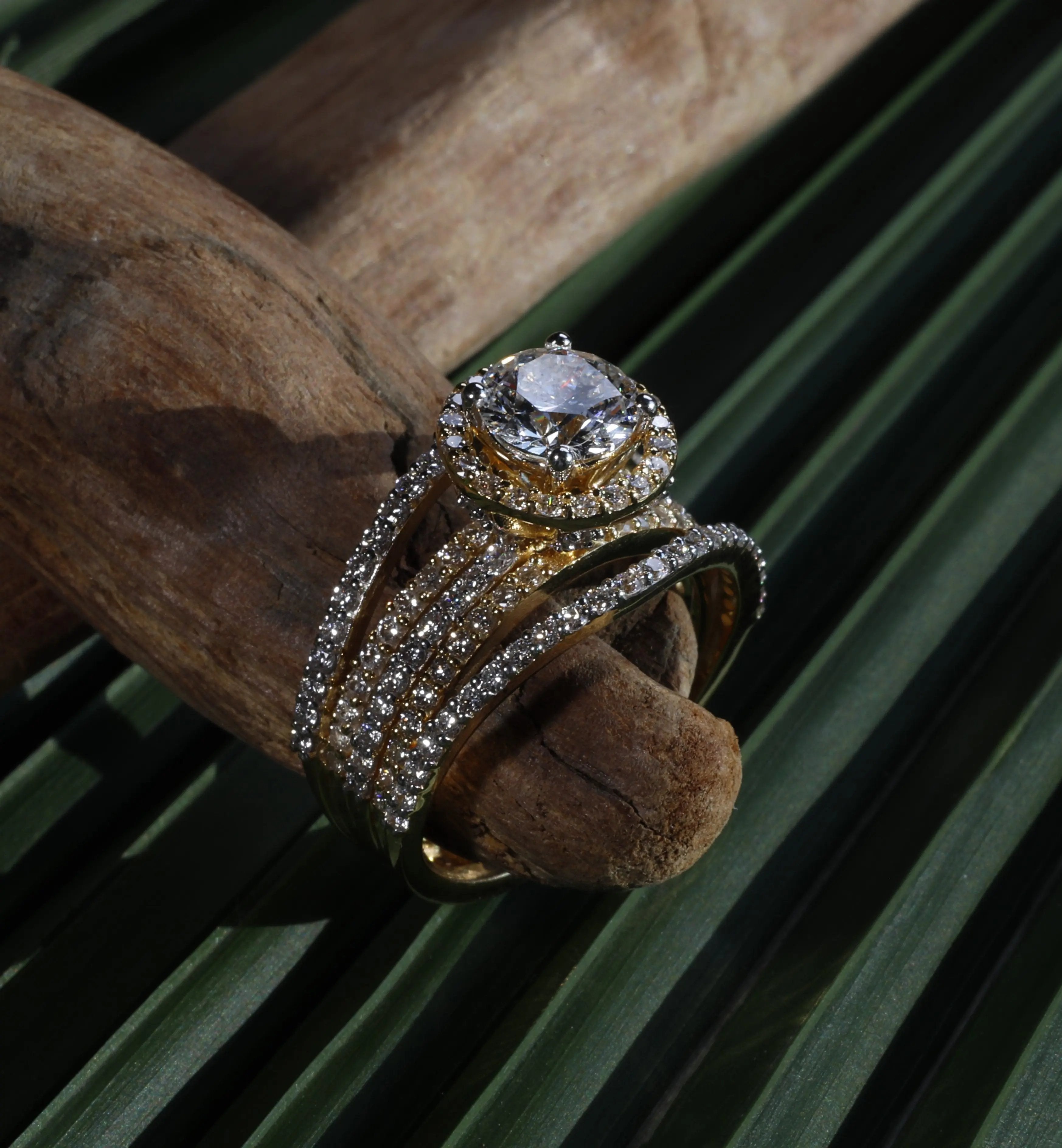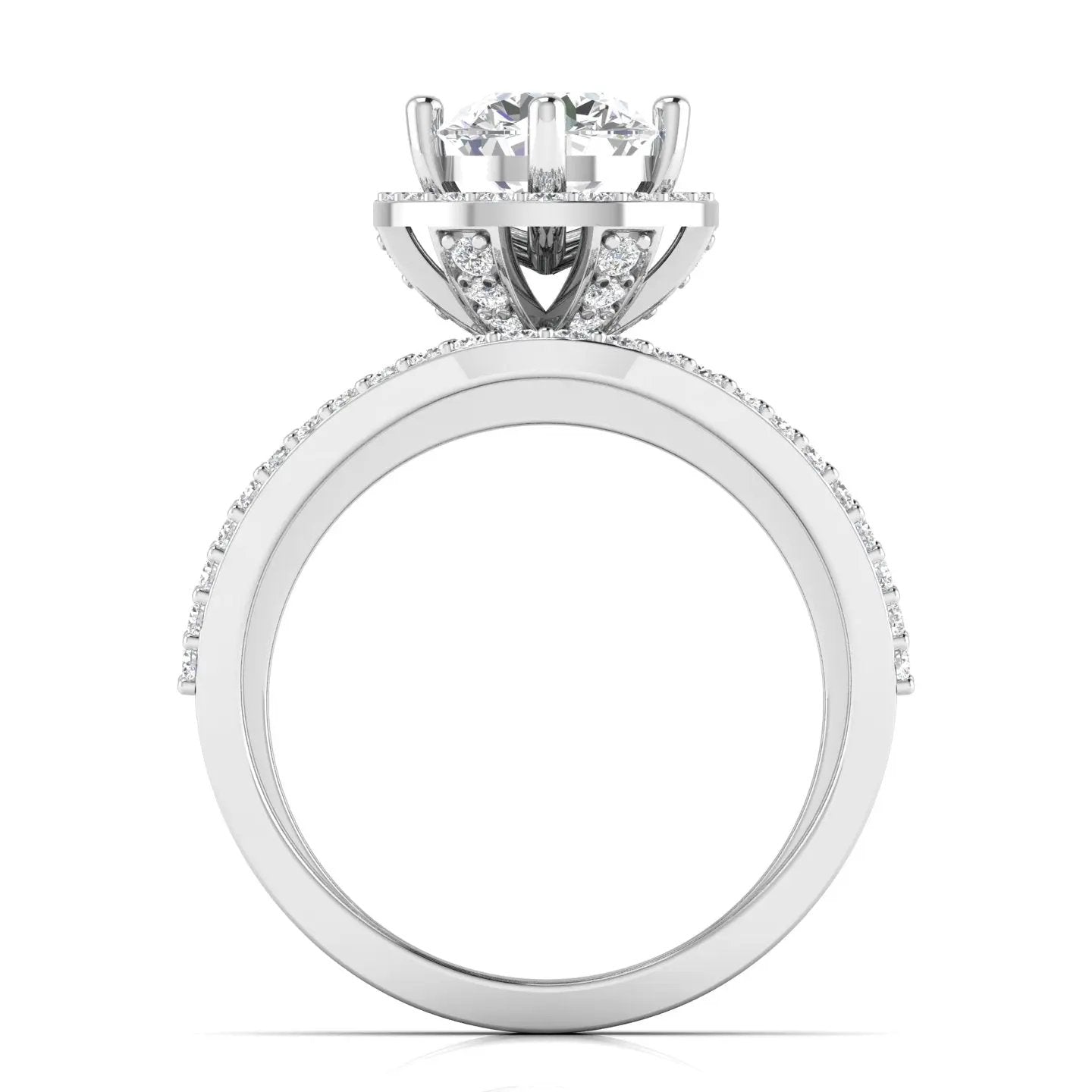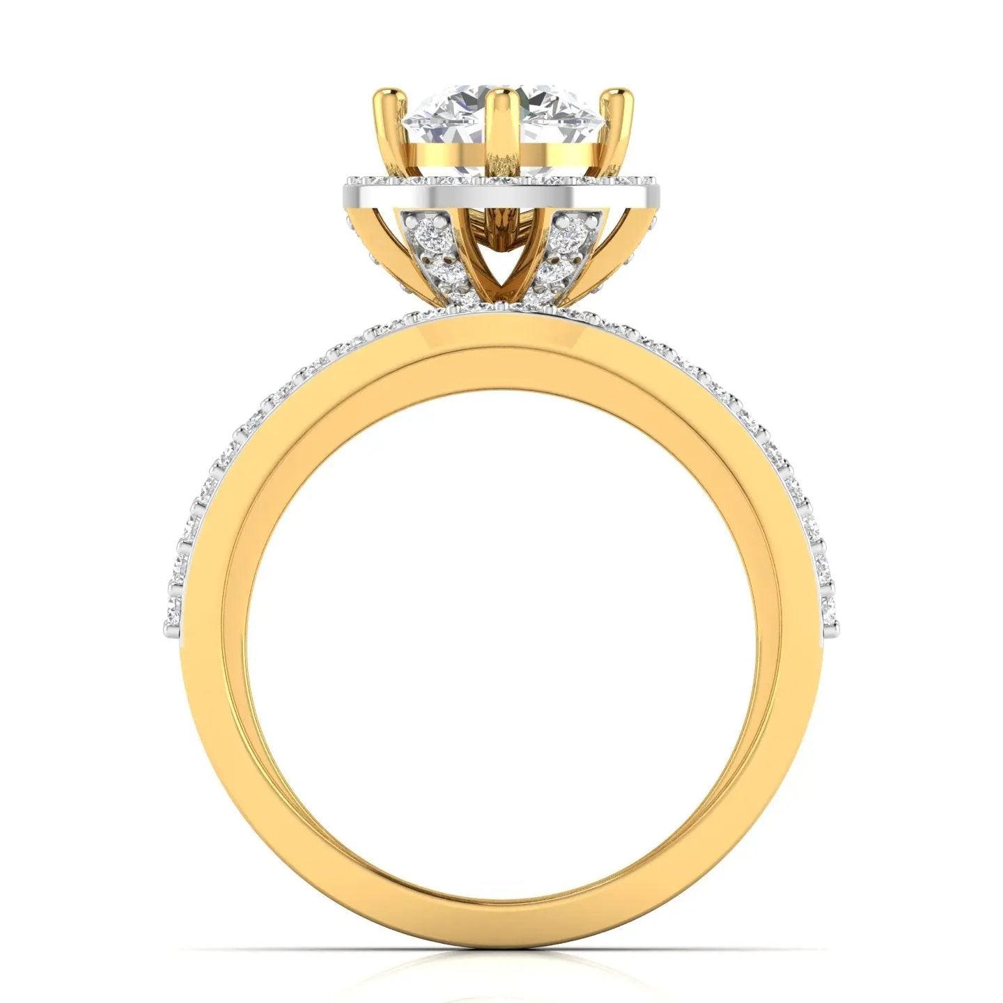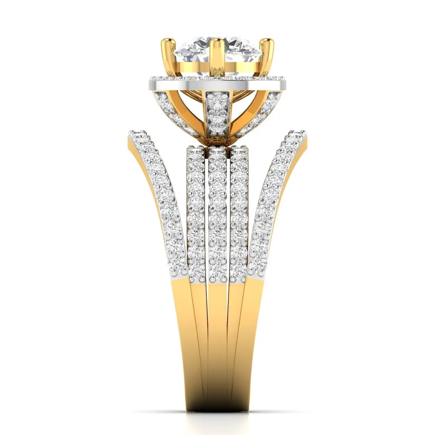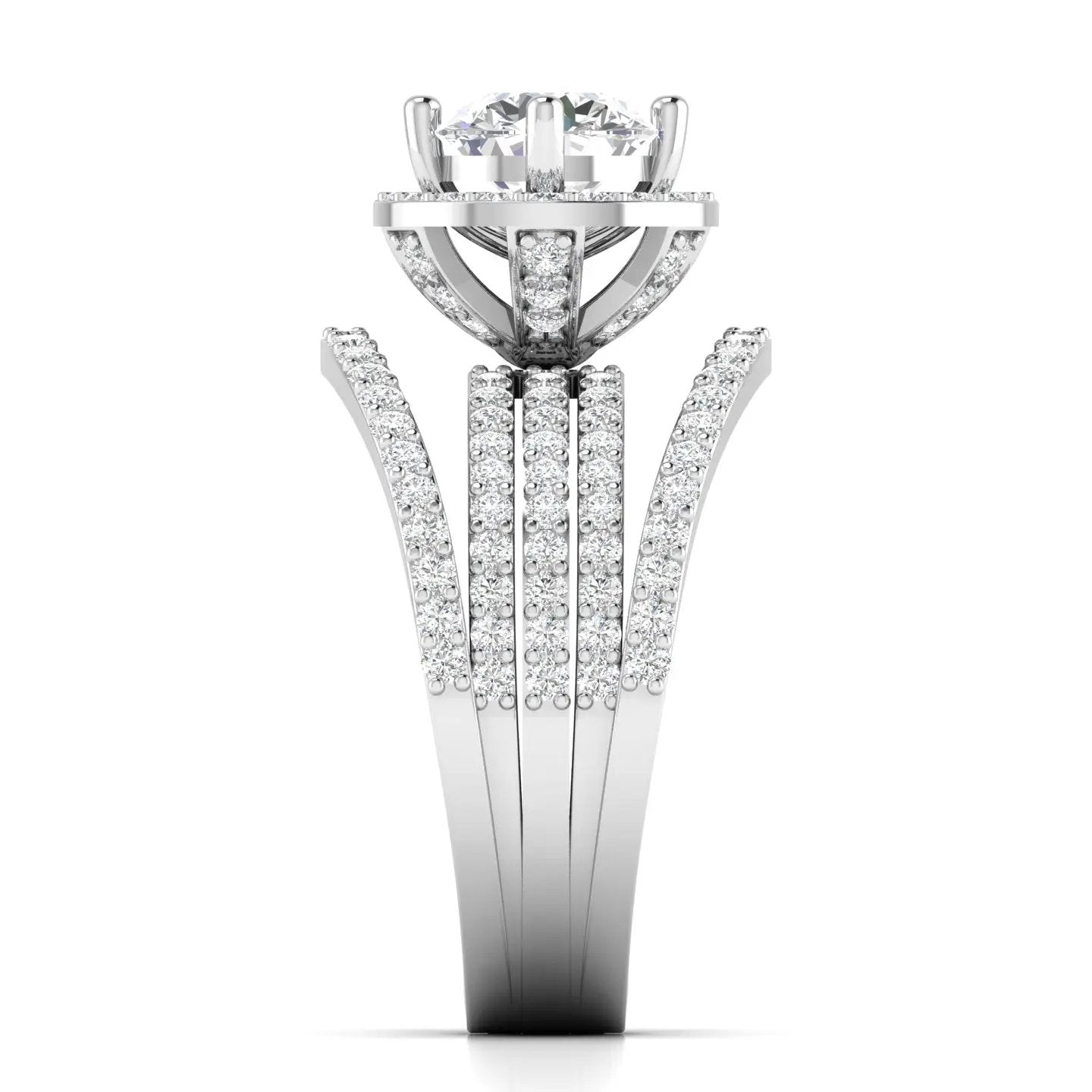 Elevate your elegance with this 1.25 Carat Diamond Engagement Ring, featuring a radiant round brilliant cut diamond framed by a dazzling halo. Crafted in luxurious gold, the wide multi-band design is adorned with pave-set diamonds, creating a captivating statement piece. Ideal as a luxury cocktail ring or a timeless engagement symbol, this sophisticated ring combines brilliance with bold style for unforgettable sparkle.