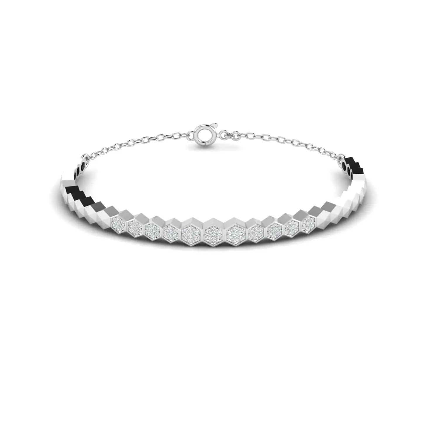 The Modern Hexagon Diamond Bracelet showcases the brilliance of lab grown diamonds arranged in a contemporary hexagonal pattern. This sophisticated accessory blends ethical craftsmanship with modern design, offering a subtle yet striking statement piece that enhances any outfit with refined elegance.