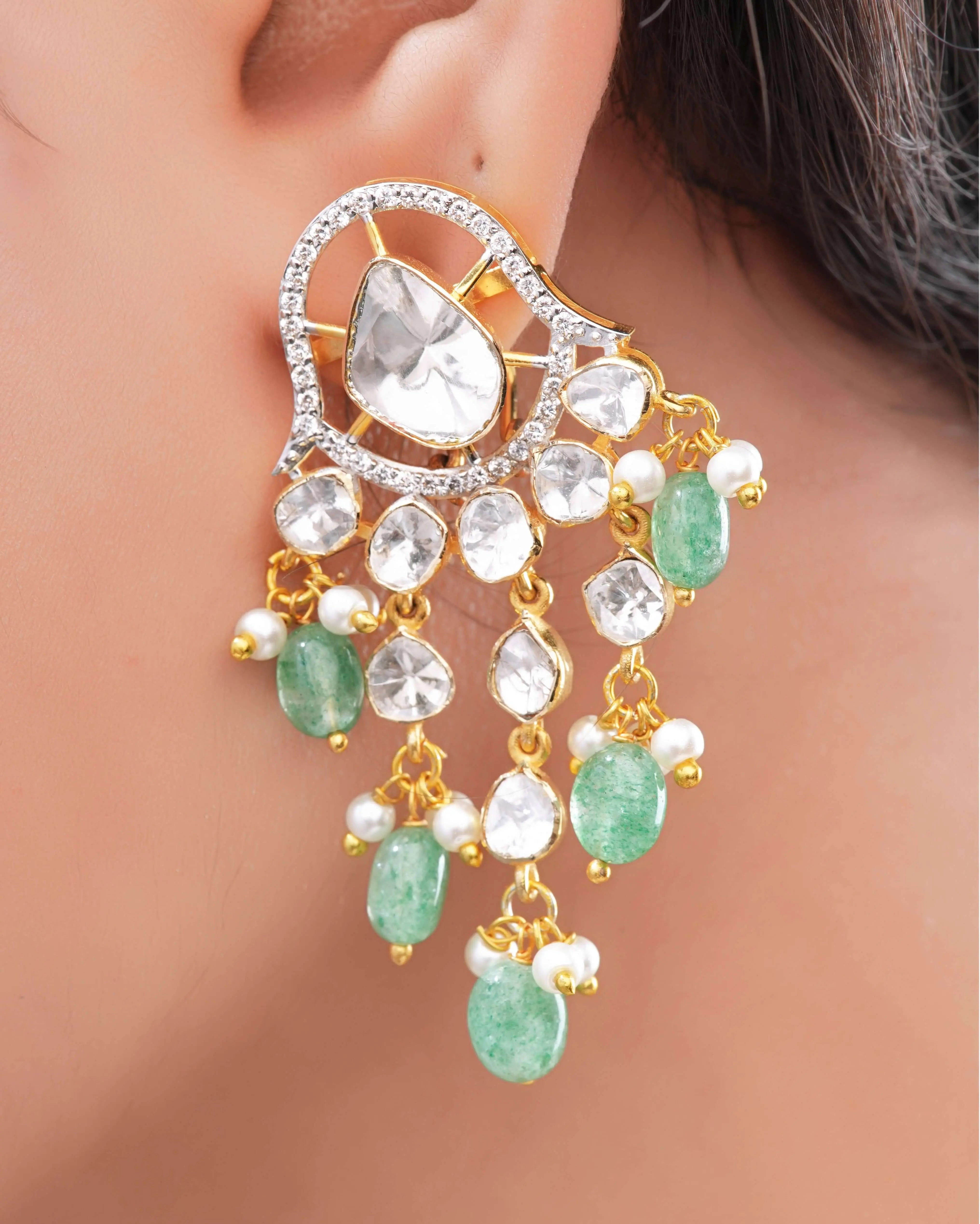 Elevate your elegance with these Ornate Polki Diamond Earrings, featuring exquisite polki diamonds paired with delicate pearl drops. Their intricate craftsmanship highlights timeless beauty, making them perfect for special occasions and adding a refined touch to any ensemble.