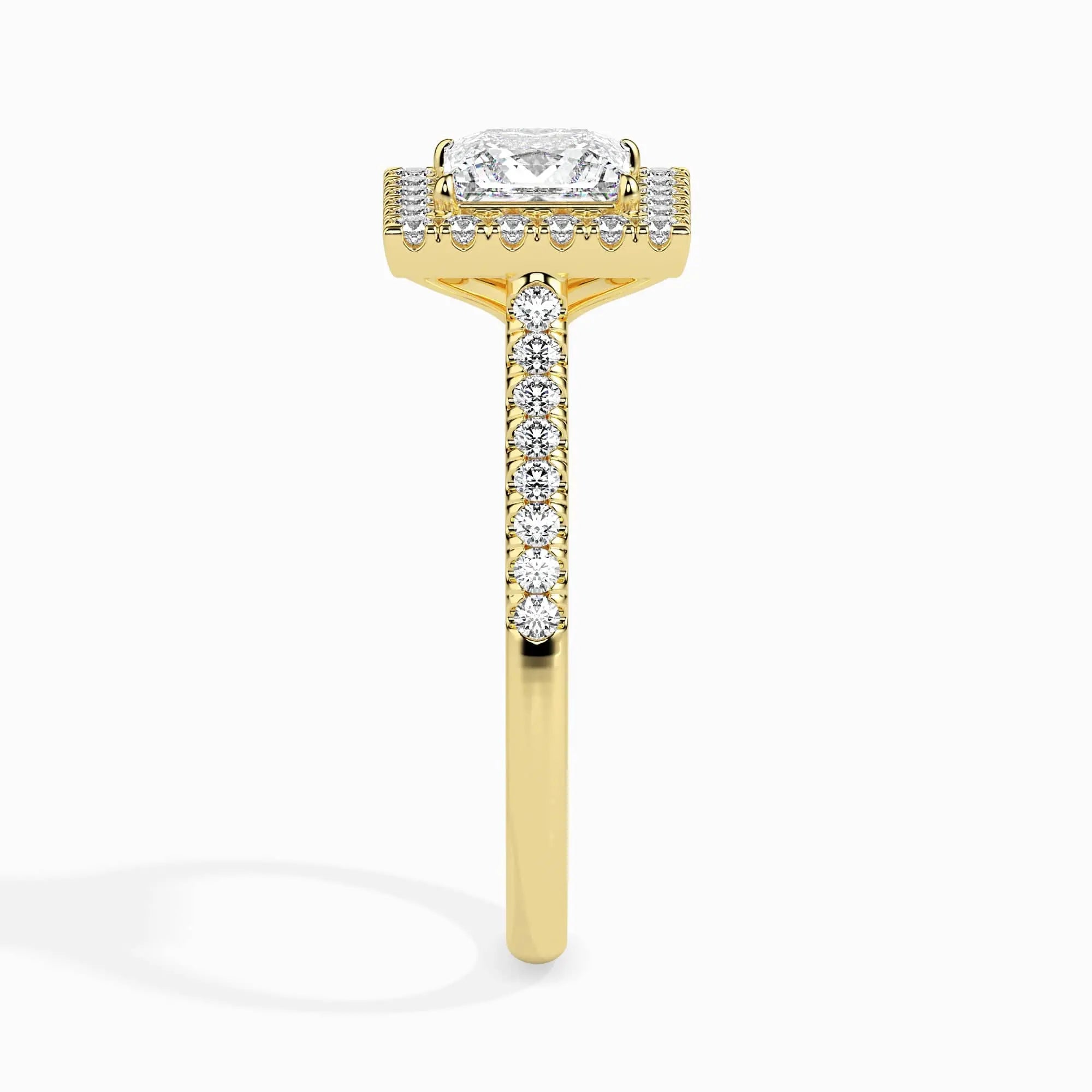 This 1 Carat Princess Solitaire Diamond Halo Ring showcases a brilliant lab grown diamond, expertly cut to highlight its clarity and fire. The elegant halo setting enhances the center stone’s radiance, offering a sophisticated and ethical choice for those seeking timeless beauty with a modern conscience. Perfect for special occasions or everyday grace.