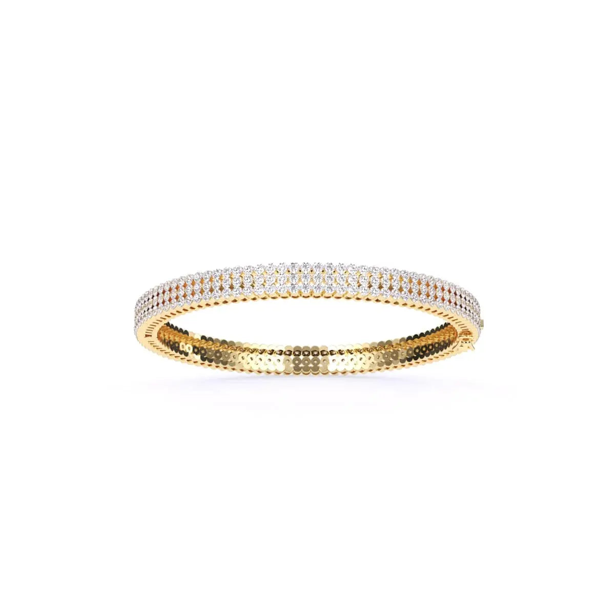 The Radiant Splendor Diamond and Gold Bangle showcases the brilliance of ethically sourced lab grown diamonds set in elegant gold. This sophisticated piece blends timeless craftsmanship with modern sustainability, offering a refined accessory that enhances any ensemble with subtle luxury and conscious beauty.
