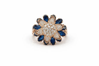 Rose Gold Floral Statement Ring with Blue Sapphire-Colored Stones and Diamonds