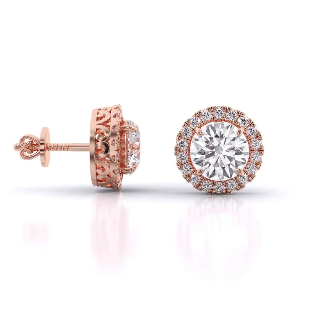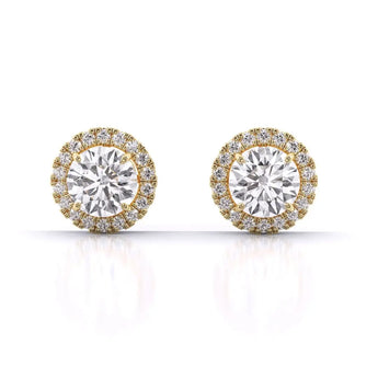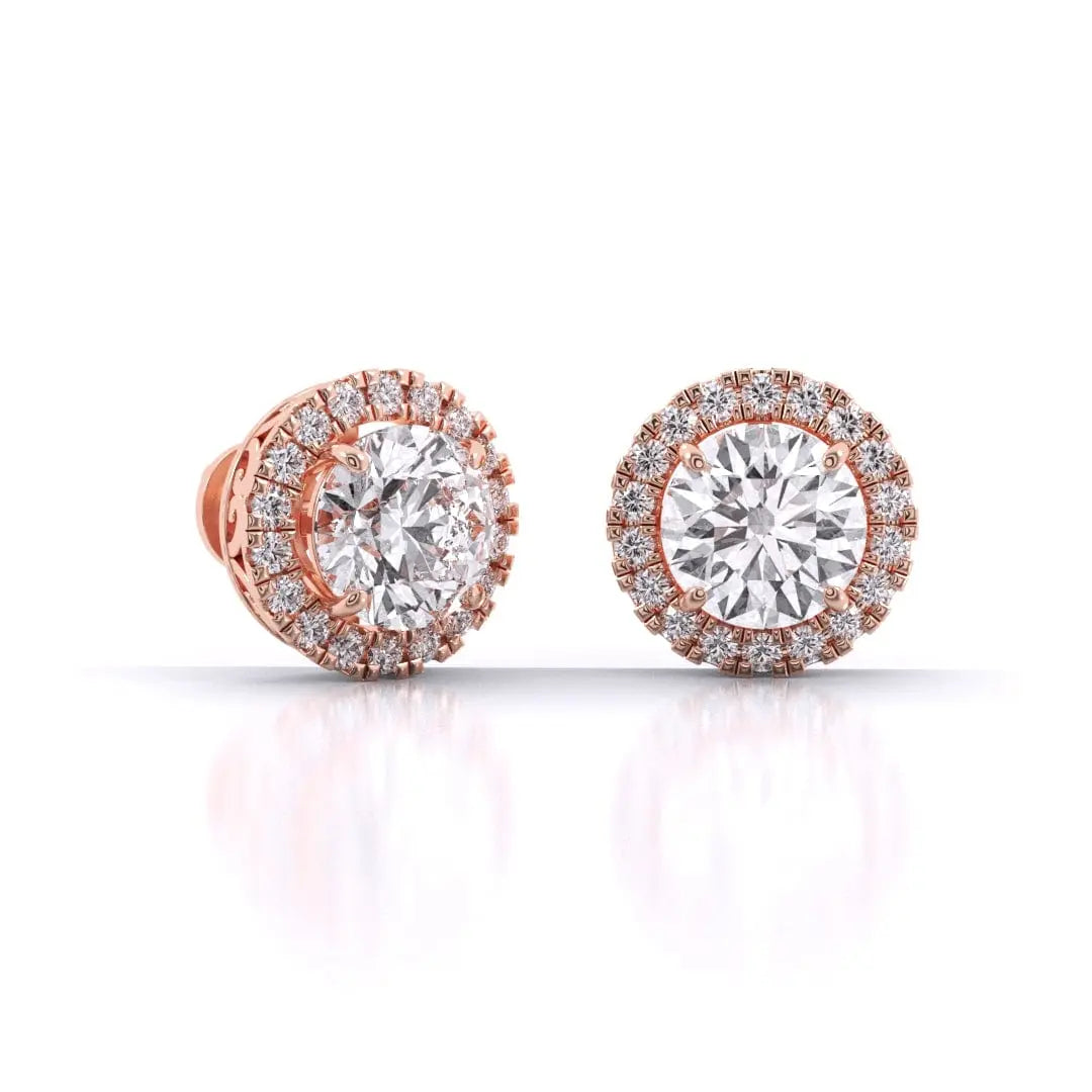 These Round Brilliant Cut Diamond Halo Earrings showcase exquisite lab grown diamonds that radiate unmatched brilliance. Designed with a delicate halo setting, they enhance the sparkle while offering a refined and timeless appeal. Perfect for those who value both elegance and ethical craftsmanship, these earrings bring a sophisticated touch to any ensemble.