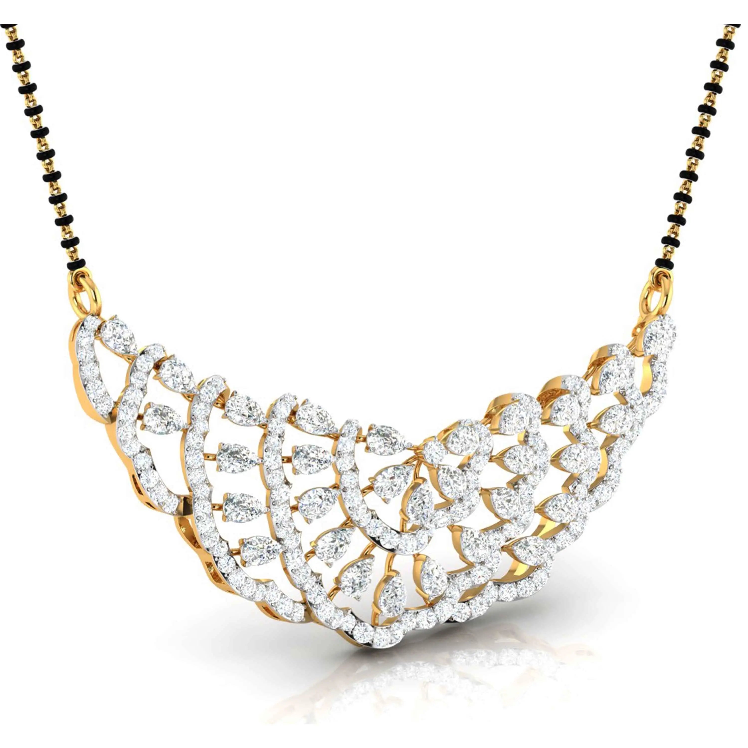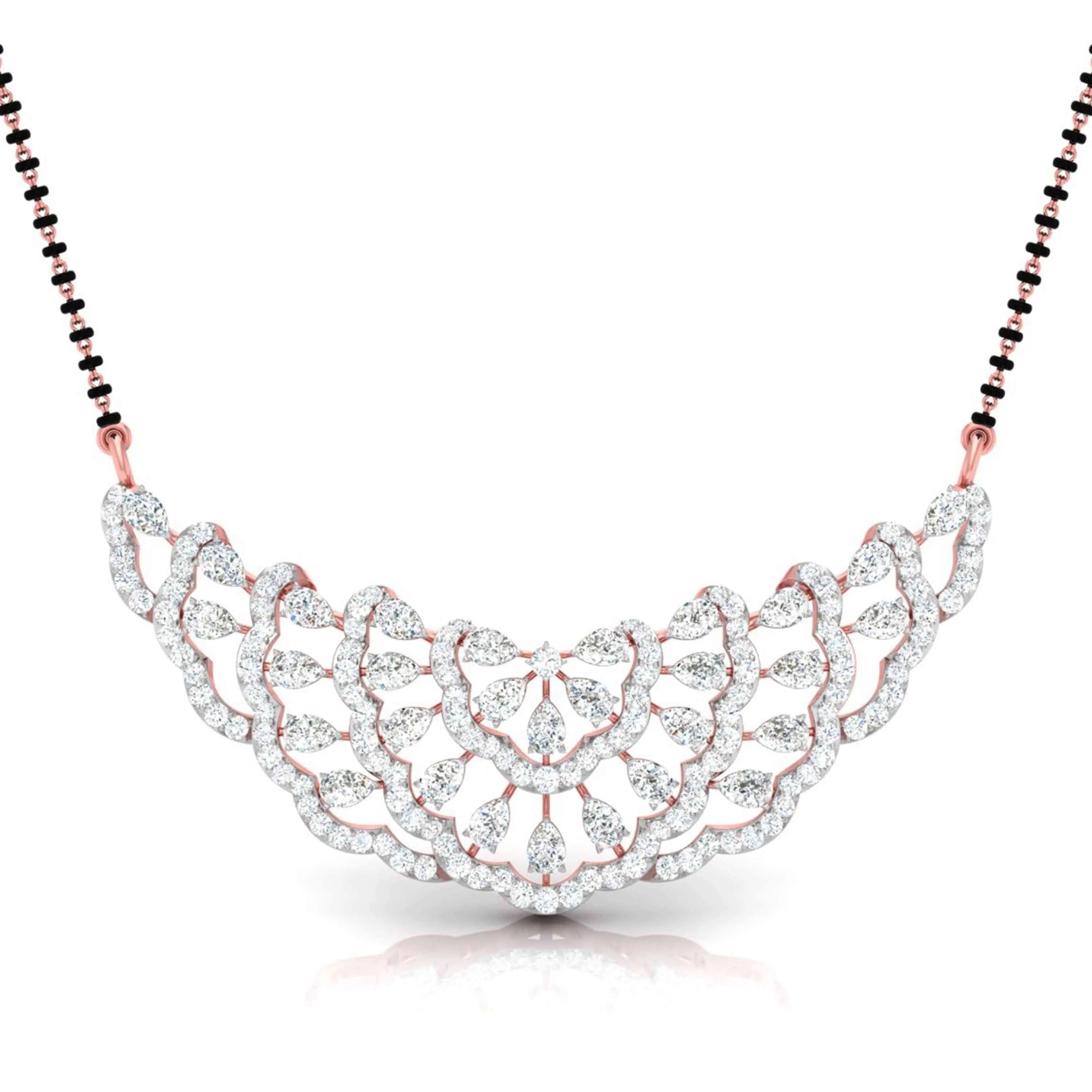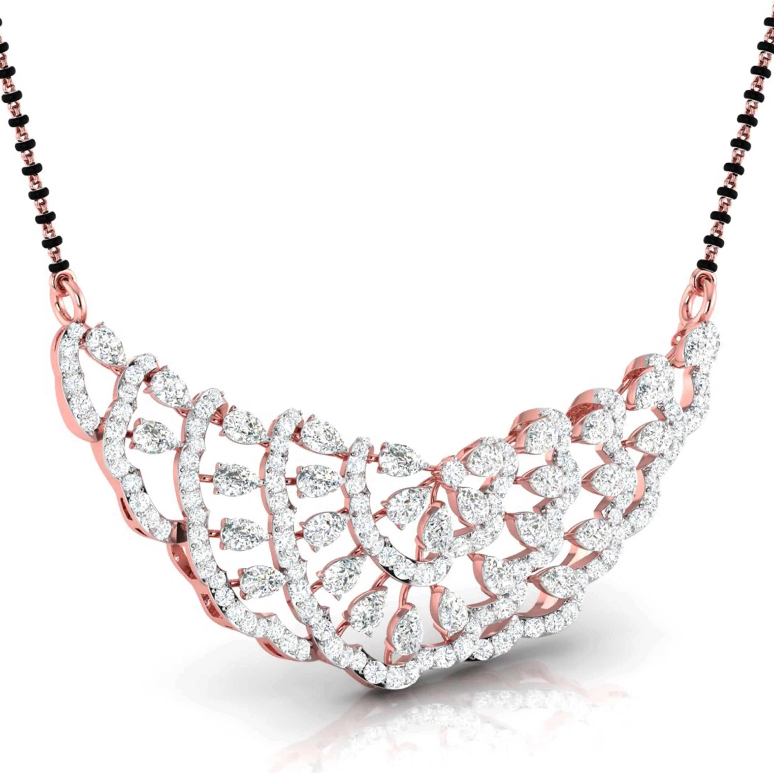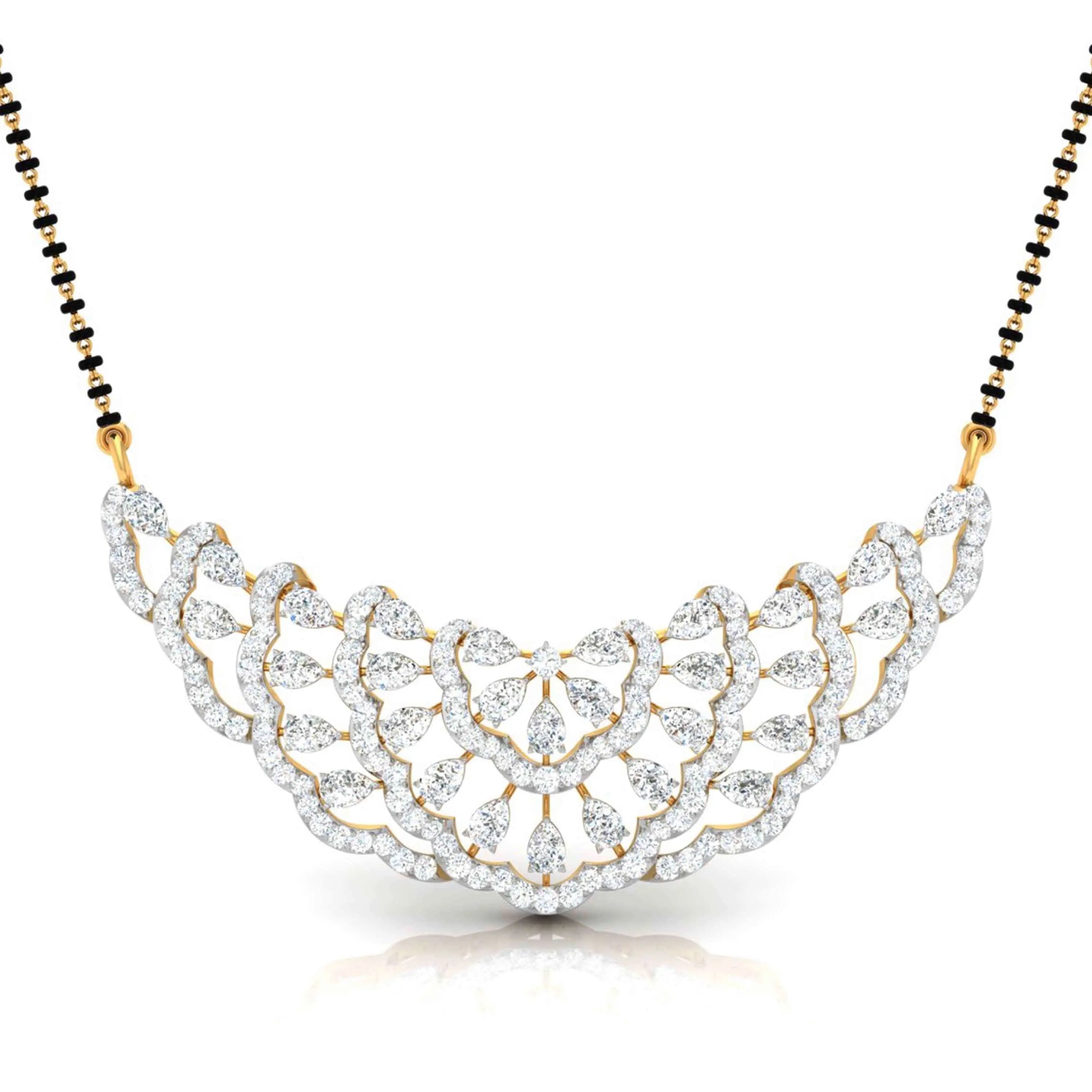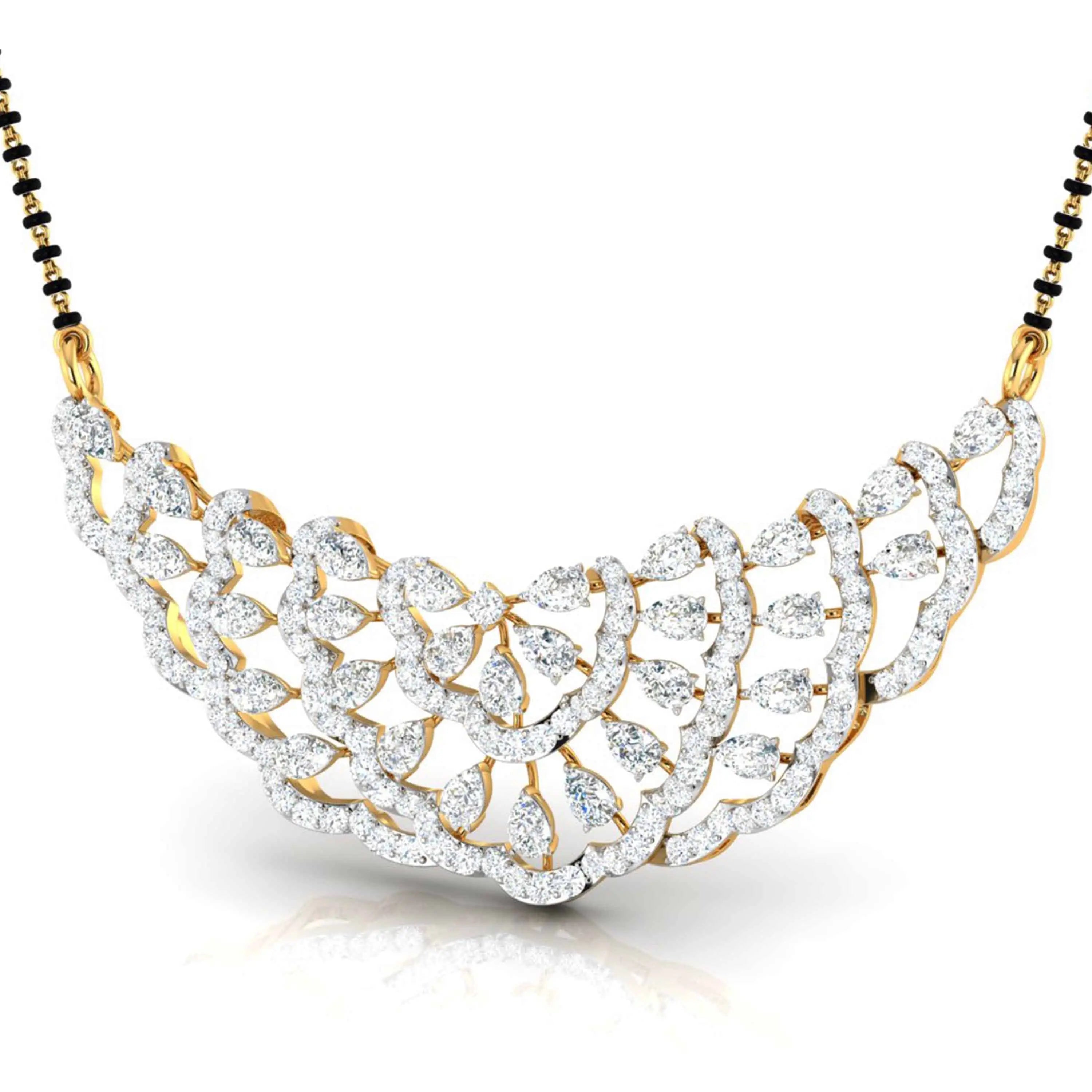 The Pear & Round Diamond Tiered Mangalsutra showcases the brilliance of lab grown diamonds in a refined, tiered design. Combining pear-shaped and round stones, this elegant piece offers a modern take on a cherished tradition, perfect for those seeking sophistication with ethical craftsmanship. Its delicate yet striking appearance makes it ideal for both everyday wear and special moments.