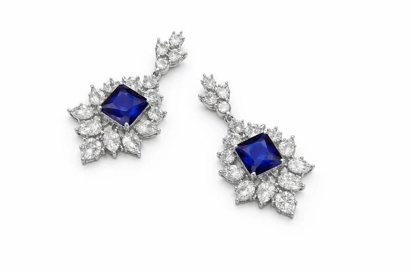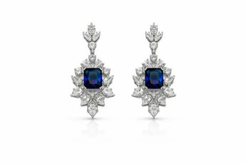 Royal Blue Sapphire Emerald-Cut Diamond Halo Statement Earrings