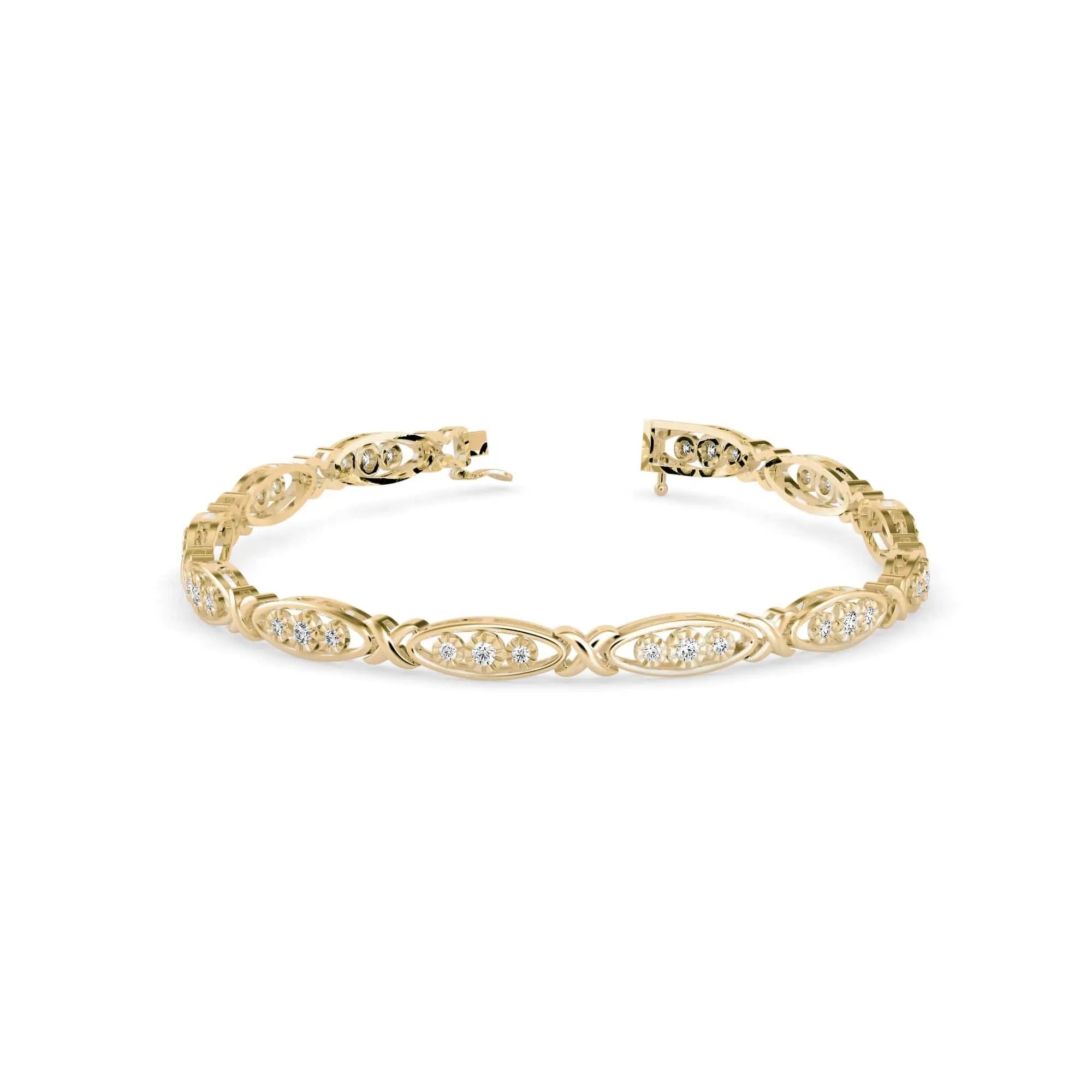 This Round Cut Diamond Studded Gold Bracelet showcases the brilliance of lab grown diamonds set in a refined gold band. Combining ethical craftsmanship with timeless elegance, it offers a sophisticated sparkle that enhances any outfit with subtle luxury. Perfect for those who value both beauty and sustainability.