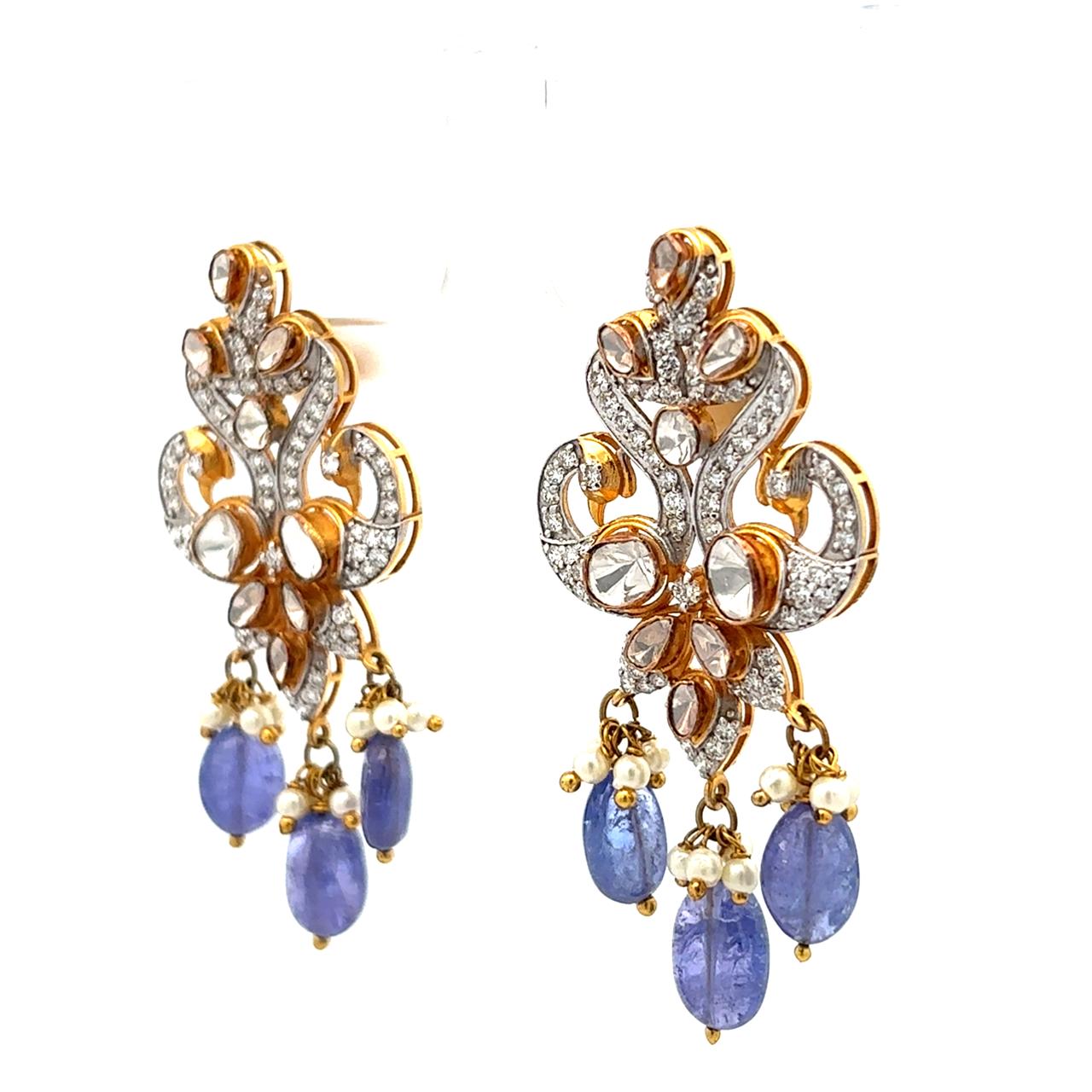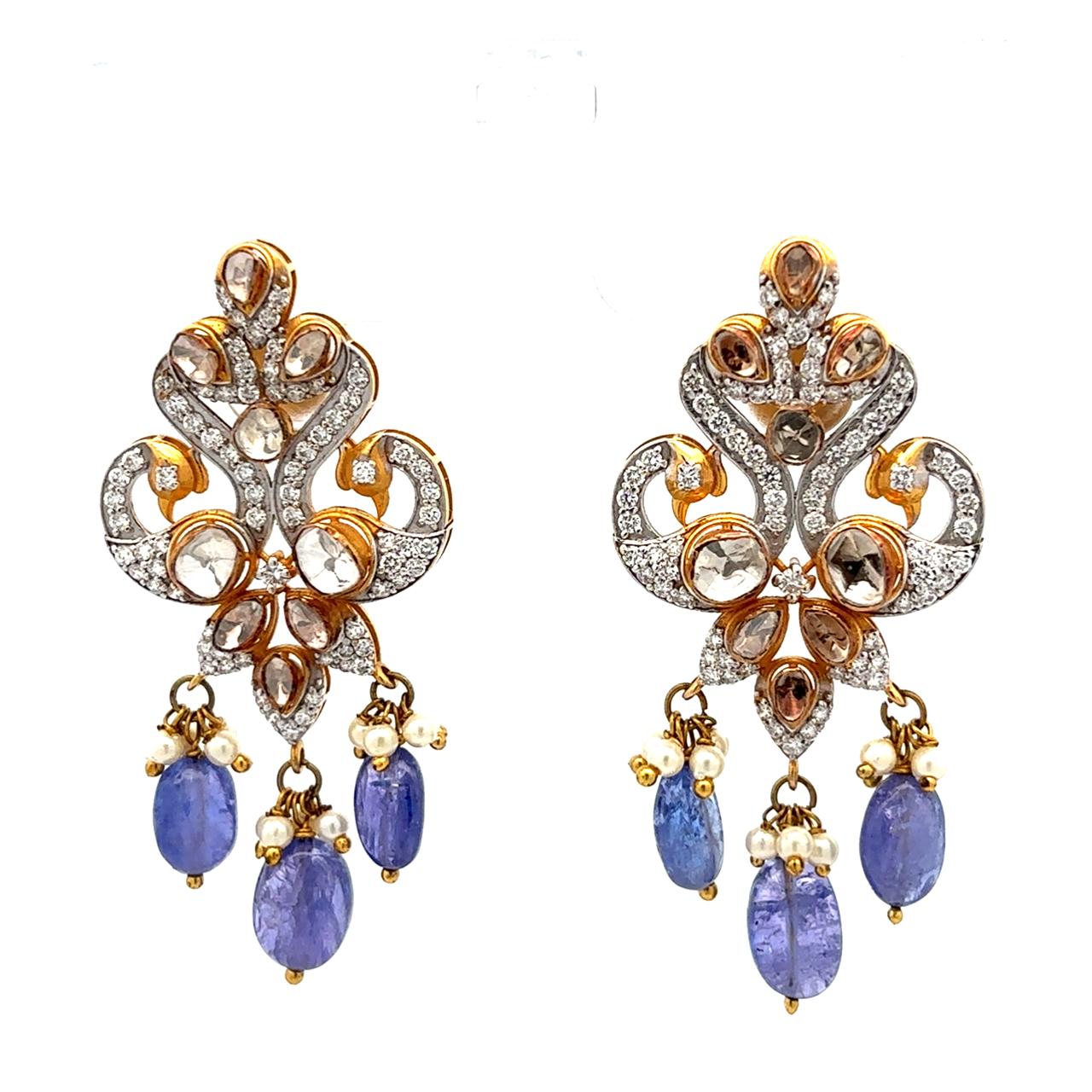 Vintage Polki Diamond & Tanzanite Beaded Chandelier Earrings with Pearls